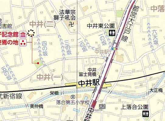 最寄りの駅は西武新宿線の中井駅である。中井駅から西に向かい四の坂の登り口までは幅広な車道を歩く。四の坂の登り口には林芙美子記念館の看板がある。今はマンションになってしまったが、四の坂道を隔てた中井駅よりには画家・刑部人のアトリエがあった。建築家・吉武東里の設計によるスペイン瓦が葺かれた洋館であった。私が越してきた20年ほど前には刑部アトリエも健在であった。急な四の坂を登ると坂の上に竣介のアトリエはあった。