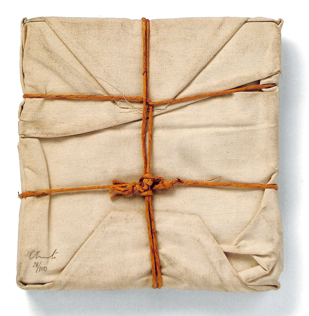 一点モノとマルチプル作品の双方で、クリストは様々な「包まれた本」、「包まれた雑誌」を手がけてきていますが、この、クリスト自身の作品集を包んだ作品には、ユニークな特色があります・・・“キャンバス地”で包まれている点です。