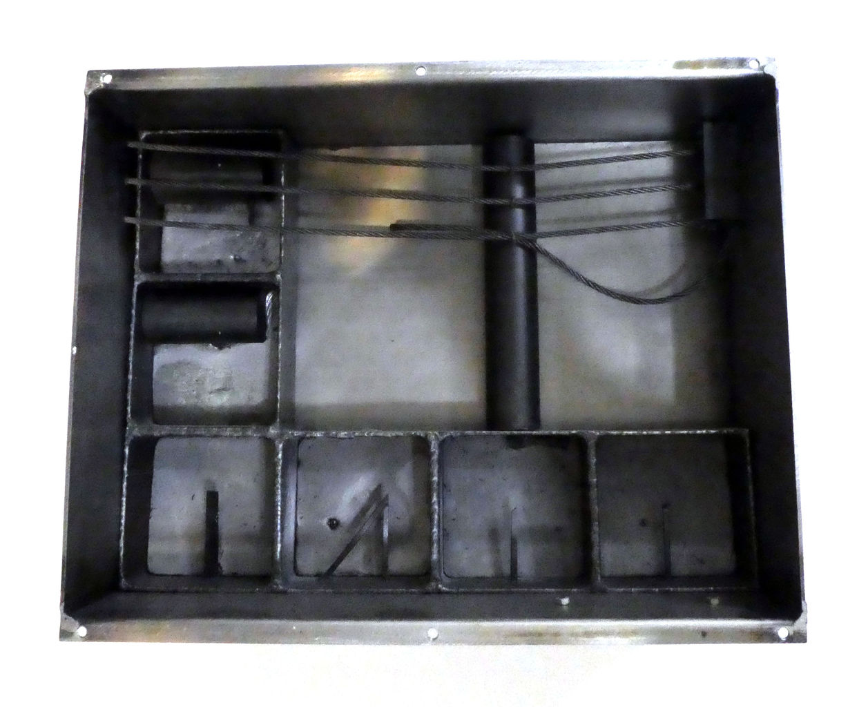 外観は、ふたの両がわに3本ずつのボルトがあり、スプリングのようなものに差し込まれたレンチが付いている以外は、取り立てた装飾もありません。というのも若林による、この作品は、箱の内部で展開されているからです。