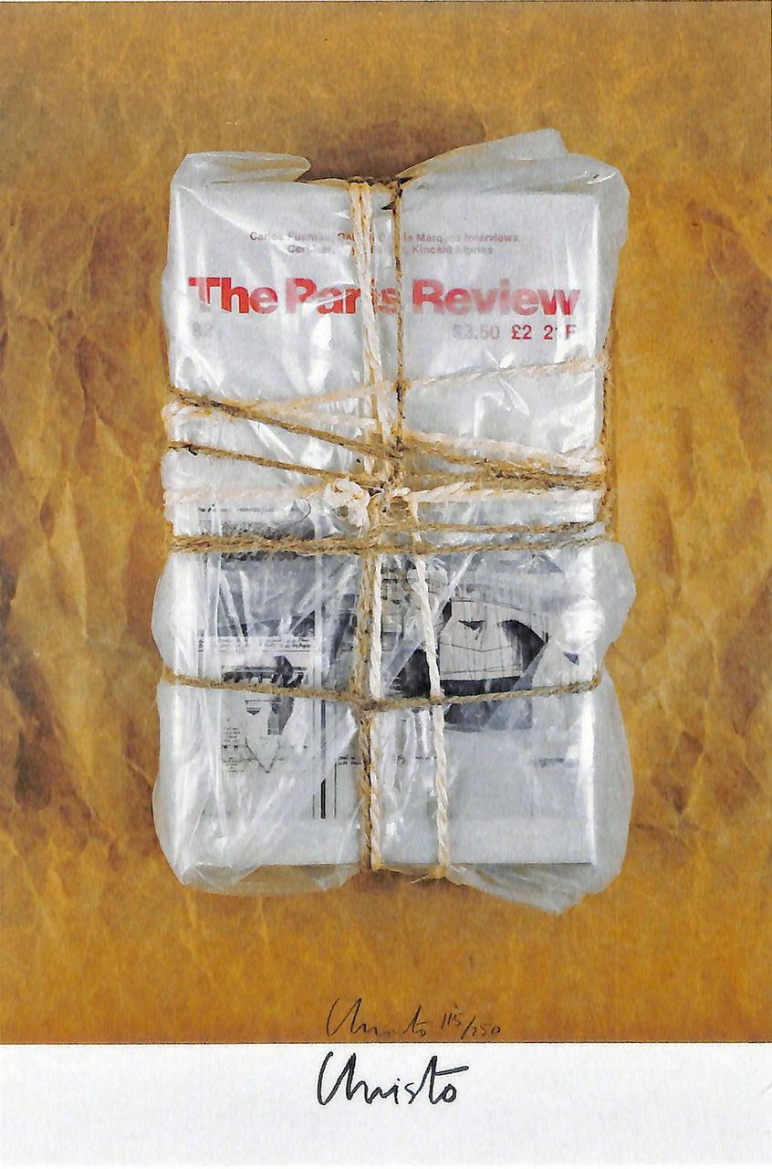 包まれた本や雑誌の殆どは、その中身が判るように、透明や半透明のビニール素材が使われています。というのも、多くの作品で、その中身が、作品に意味を付加しているからです。たとえば、1982年の「包まれたパリ・レビュー」という作品は、この文芸雑誌の表紙に、「包まれたポンヌフ」のドローイングの絵はがきを貼り付けてからビニールで包んだものです。オブジェ作品も、プロジェクトを実現させるためのプロモーション活動の一環に取り入れたかったのだと想像できます。また、1985年の「包まれたニューヨーク・タイムス」は、1985年6月13日の新聞であることが、ビニール越しに確認できます。これは、クリスト、そして、ジャンヌ=クロードが、共に50歳になった誕生日です(二人は、1935年6月13日、全く同じ日に生まれています)。これらの作品では、中身が確認できることが重要な意味を持つことは間違いないでしょう。