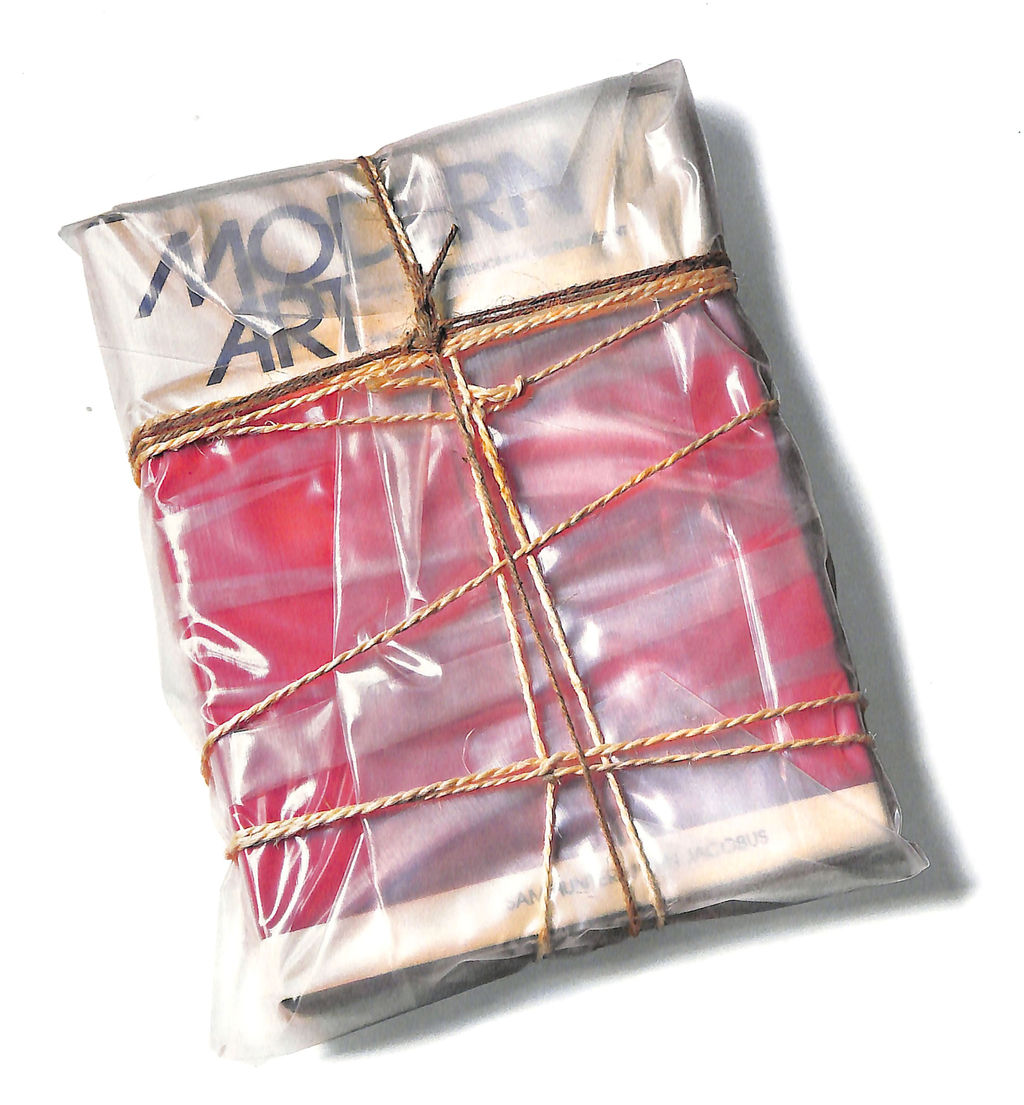 (モダンアート)包み込まれた、中身の本が特に重要な意味を持つ、もう一つの作品も紹介させてもらいましょう。1978年の「包まれた現代美術の本」です。これはアメリカを代表する美術雑誌、アート・ニュース誌が世界中の現代美術家に送った、「あなたは誰から一番影響を受けましたか?」というアンケートをきっかけに制作された作品です。クリストは、特定のアーティストの名前を挙げる代わりに、サム・ハンターとジョン・ジェイコブス著の大型本、「現代美術」をビニール素材と紐で包み、「私の回答はこの中です」というコメントを添えて編集部に送ったといいます。クリストの遊び心を感じさせるエピソードですが、この作品は、その後120部限定のマルチプル作品として、エブラムス社から発行されました。ちなみに、中身が読めるように、「包まれた現代美術の本」は、包まれていない新本一冊とセットになっていました。