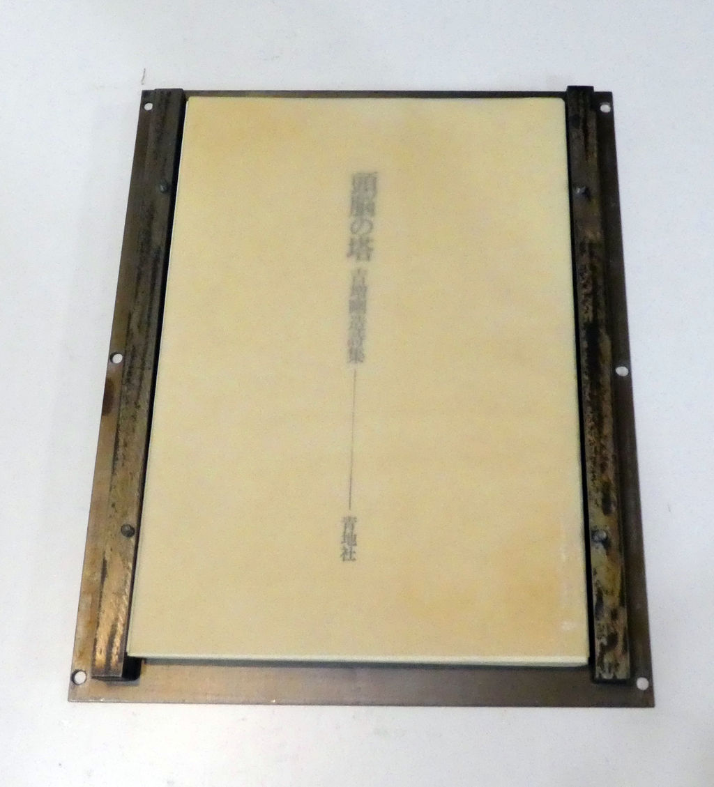 重い蓋は、2㎝程度の厚みがあり、4つの蝶ねじがついています。このねじを外すと、蓋の内側部分が取り外せるようになっていて、その中には白い表紙の一冊の本が隠されています。吉増剛造の詩集、「頭脳の塔」です。若林のこの重厚な作品は、詩集のための収納箱でもあるわけです。「Libre Objet」が作られるに至った経緯については、残念ながら聞いたこともなく、また資料も持ち合わせていません。ただ蓋が、詩集をぴったりと内包できるようなサイズであることを考えると、まず、書物ありきの作品だったと推測できるでしょう。どちらにしても、書物と融合した美術作品の傑作の一つであることに、異議を唱える人はまずいないと思っています。