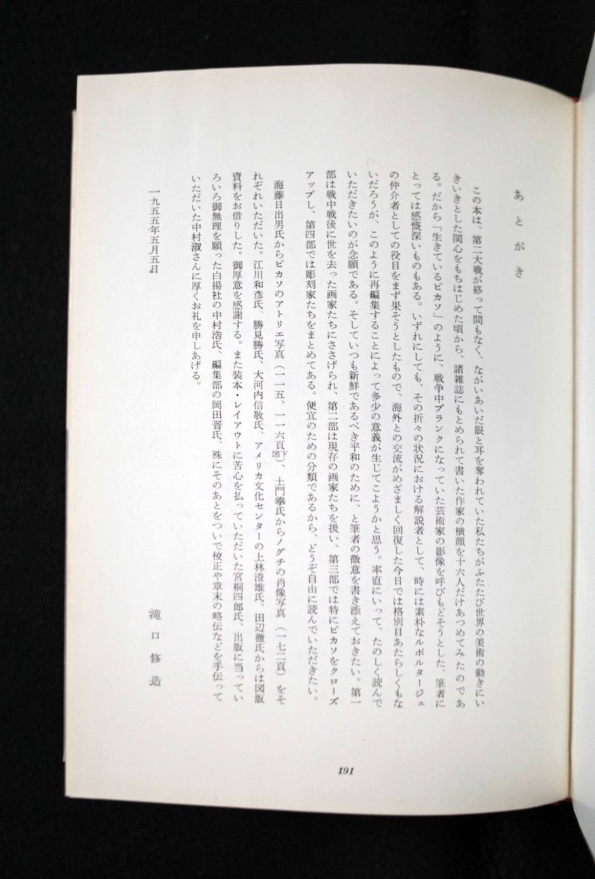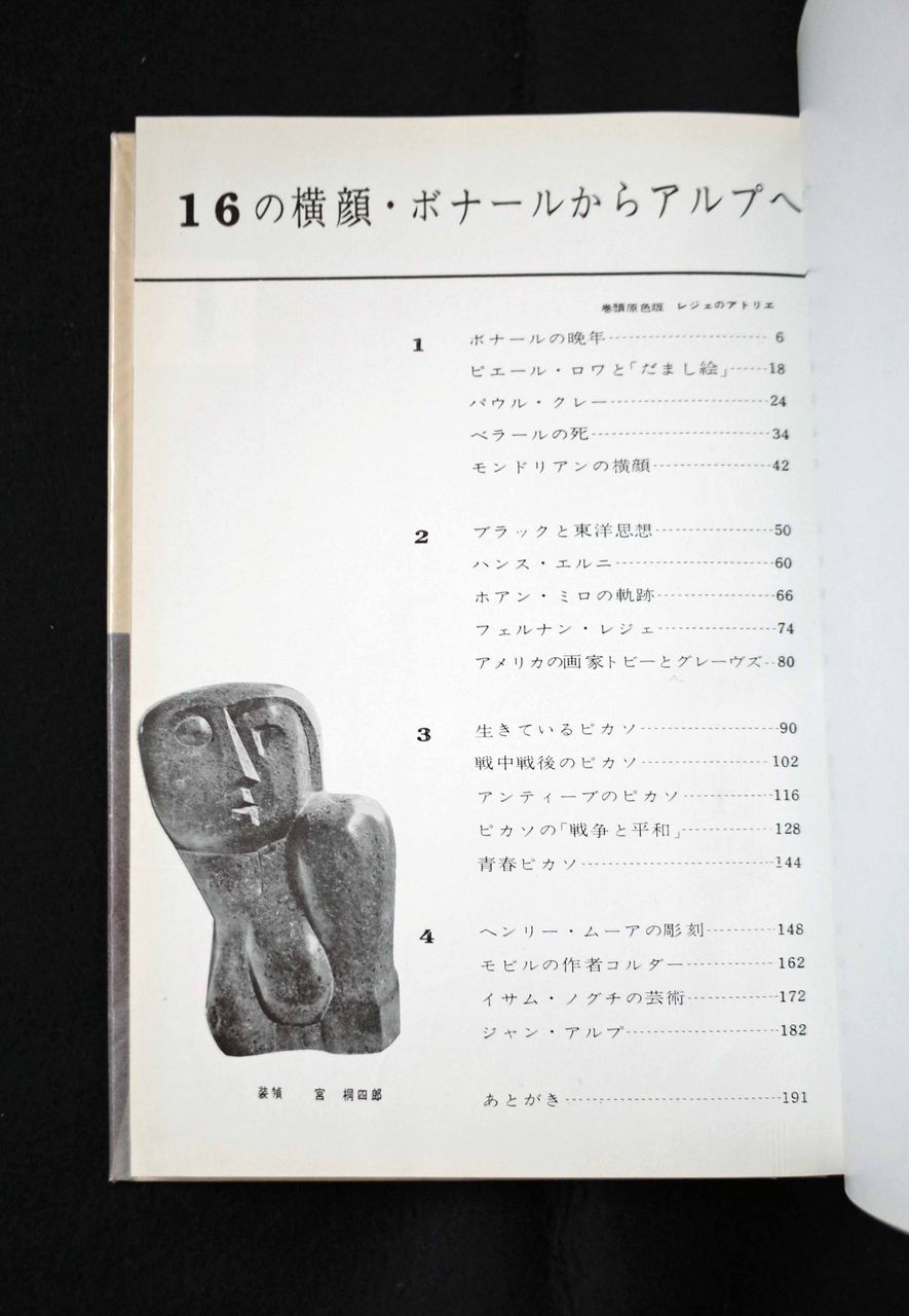 「この本は、第2次大戦が終わって間もなく、ながいあいだ眼と耳を奪われていた私たちがふたたび世界の美術の動きにいきいきとした関心をもちはじめた頃から、諸雑誌にもとめられて書いた作家の横顔を十六人あつめてみたのである。だから「生きているピカソ」のように、戦争中ブランクになっていた芸術家の影像を呼びもどそうとした、著者にとって感慨深いものもある。いずれにしても、その折々の状況における解説者として、時には素朴なルポルタージュの仲介者としての役目をまず果たそうとしたもので、海外との交流がめざましく快復した今日では格別目あたらしくもないだろうが、このように再編集することによって多少の意義が生じてこようかと思う。率直にいって、たのしく読んでいただきたいのが念願である。そしていつも新鮮であるべき平和のために、と著者の微意を書き添えておきたい。[後略]」