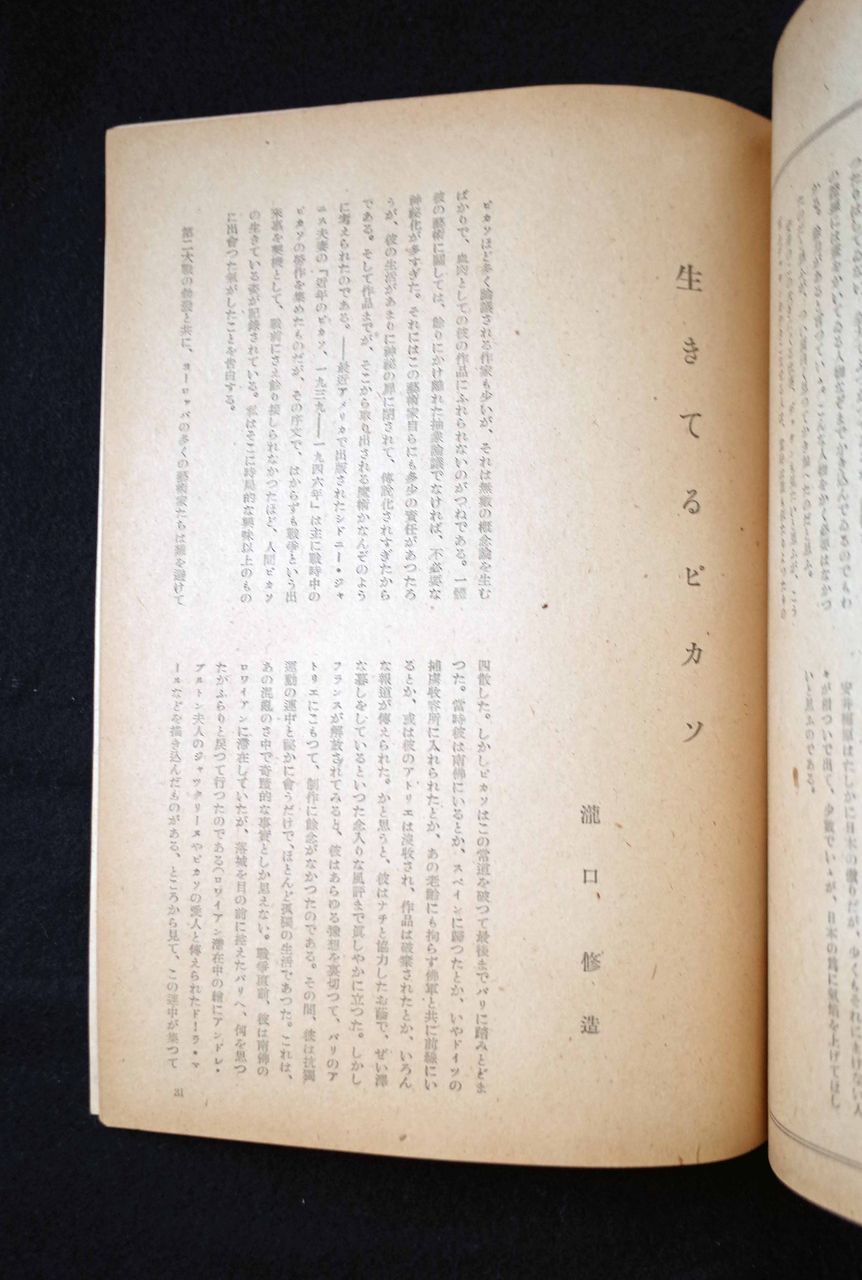 図7 「ボナールの晩年」冒頭部さて、本書の際立った特色は、何と言っても第3部がすべてピカソに充てられていることでしょう。特に「あとがき」でも触れられた「生きているピカソ」(図8)は、1947年12月に雑誌「創美」創刊号(図9)に発表された、たいへん印象的な論考で、第2次大戦中に行方知れずだったピカソの消息と生活ぶりが判明した際の驚きや感動が、次のような記述からも伝わってきます。