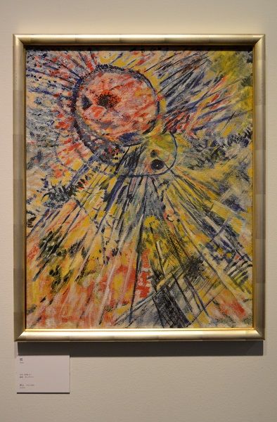 原色を使った荒々しい筆触で描かれた《風》。左上方部にある円形や四方に発光するイメージは、最晩年の作品の徴候として見てとれる。何か手応えを得たかのような思い切りのいい作品である。