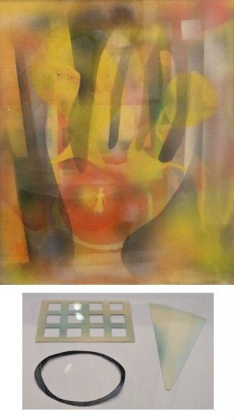 4)ガラス、セロファン、スプレー、型紙、印画紙、色彩(色点)などを駆使し、多層(レイヤー)的な画面を表現しようと試みている。このことで、平面的な画面に立体的なイリュージョンを見せる効果が期待できる。