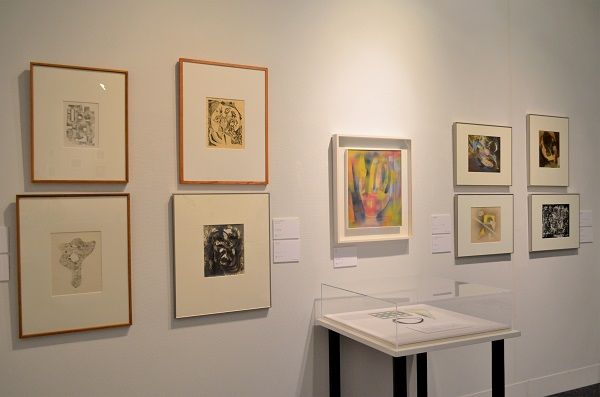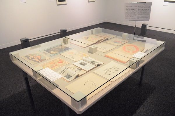 瑛九と光春の交流関係が分かるスケッチ類が平台に広げられている。左側が瑛九に関するコーナーで右側が山田光春のコーナーである。ご遺族の山田光一氏から寄贈を受けた光春のスケッチ類と、都夫人の協力で以前から美術館で所蔵していた瑛九の作品が並べられた。