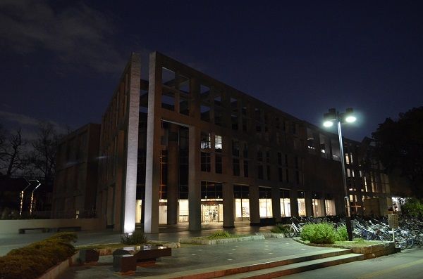 埼玉県立近代美術館の外観。取材は午後1時から、気がつけば美術館はすっかり夜の風景に包まれていた。