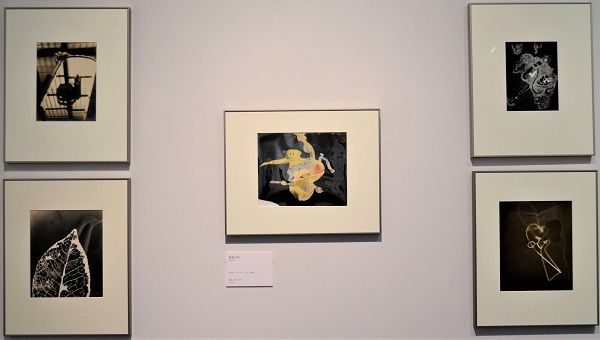 カメラを使用したイメージ(《作品(45)》)では、目の前の事物がそのまま印画紙に写し取られるが、作家の意図や絵画性が弱くなる。カメラを使用せず、透過性のあるレースやセロファンなどを印画紙に置いて感光したイメージ(《作品(69)》《風》)を生成する方法がある。さらに、コラージュ作品(《作品Ⅰ》《作品Ⅱ》《声》《作品Ⅴ》)のように、既存の図にハサミを入れて、再構成する作品があり、中でも今回が初公開となる瑛九の作品《声》は、近代的なビル群のイメージを背景に据えた新即物主義的な画面にまとめられている作品である。また、印画紙に彩色を施す作例(《作品(69)》)もあり、実に表現が多彩である。