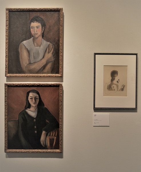 初期に制作された作品。向かって左2点は《十三子姉》1929年、油彩、カンヴァス(板で裏打ち)、《女性像》年代不詳、油彩、カンヴァス(板で裏打ち)、左上には瑛九の本名杉田秀夫のイニシャル「H・S」のサインが認められる。まだ「瑛九」と名乗る前の作品である。