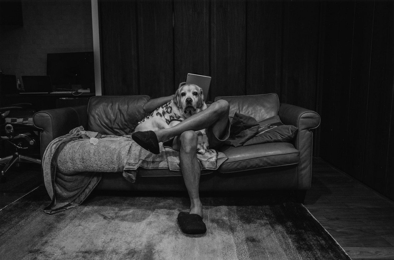 もうひとつ目を引くのは犬と一緒に座っている飼い主の足である。