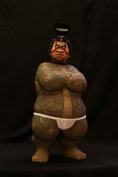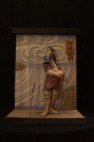今回出品する〈男気〉シリーズは、褌一丁の体格のいい若い男性像に、弟子の彫刻家・長崎美希が高密度の刺青画を手彩しています。刺青画は鯉や龍、桜などの和風の刺青デザインがアクリルで描かれており、その繊細な絵に魅了される人も多くいます 。小さいものは30cmから、大きいものは2m以上の大作彫刻があり、小さいものはその緻密さに感激し、大作はその迫力に圧倒されるでしょう。また、近作の〈KABUKI 歌舞伎〉や〈浮世絵〉シリーズでは、葉栗は平面の画像に奥行きや背面などの要素を加えて立体の像を作り上げるという、浮世絵師たちの真逆のプロセスを全て頭の中で行ない、スケッチなどを描かずに直接素材に彫り込み、これらの像を制作しています。