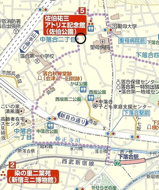 今回の散歩の出発点は西武新宿線の下落合駅である。北口改札をでて、すぐに右に歩くと妙正寺川にでる。ここには西橋がかかっている。橋を渡って左にゆくと落合中通りにでる。目の前には新目白通りがある。新目白通りを渡り、そのまま坂を登れば聖母病院にいたる道であるが、その脇にある狭い坂道(西坂)を登る。この道の上には旧徳川男爵家の屋敷があったが、今は学生寮に変わった。坂を登りきると三差路になっていて右の道に入る。すぐに左手に「かば公園」がある。道なりに歩くと台地上の尾根を行くことになる。右手に聖母病院に入る道の手前が吉田博邸、版画工房のあった場所である。ここで吉田の代表的な木版画は制作され、息子たちである遠志や穂高が成長し、また息子たちも版画を制作するようになるのだった。吉田邸は大きな洋館として記憶されているが、そばには聖母病院、佐伯祐三アトリエ記念館があるといった立地だ。