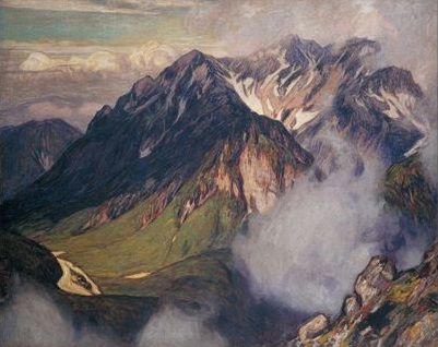 「穂高山」吉田博は明治9(1876)年福岡県久留米市の生まれ。京都で洋画を学び、三宅克己の影響で水彩画を描き始める。初めての渡米は明治32(1899)年のこと。中川八郎とともに渡米、デトロイト美術館とボストン美術館での展覧会に参加している。その後、イギリス、フランス、ドイツ、イタリアなどを歴訪した。明治35(1902)年、吉田の発案により太平洋画会を満谷国四郎や中川八郎とともに結成した。吉田は早くから風景を題材にした作品を描いたが、特に山岳や建物をモチーフにすることを好んだ。従い、息子の名前に穂高を選んだのだろう。大正9(1920)年、新版画の版元の渡辺庄三郎と出会い、渡辺木版画舗から木版画の出版を始めた。透明感のある色彩と光の表現が美しい作品である。