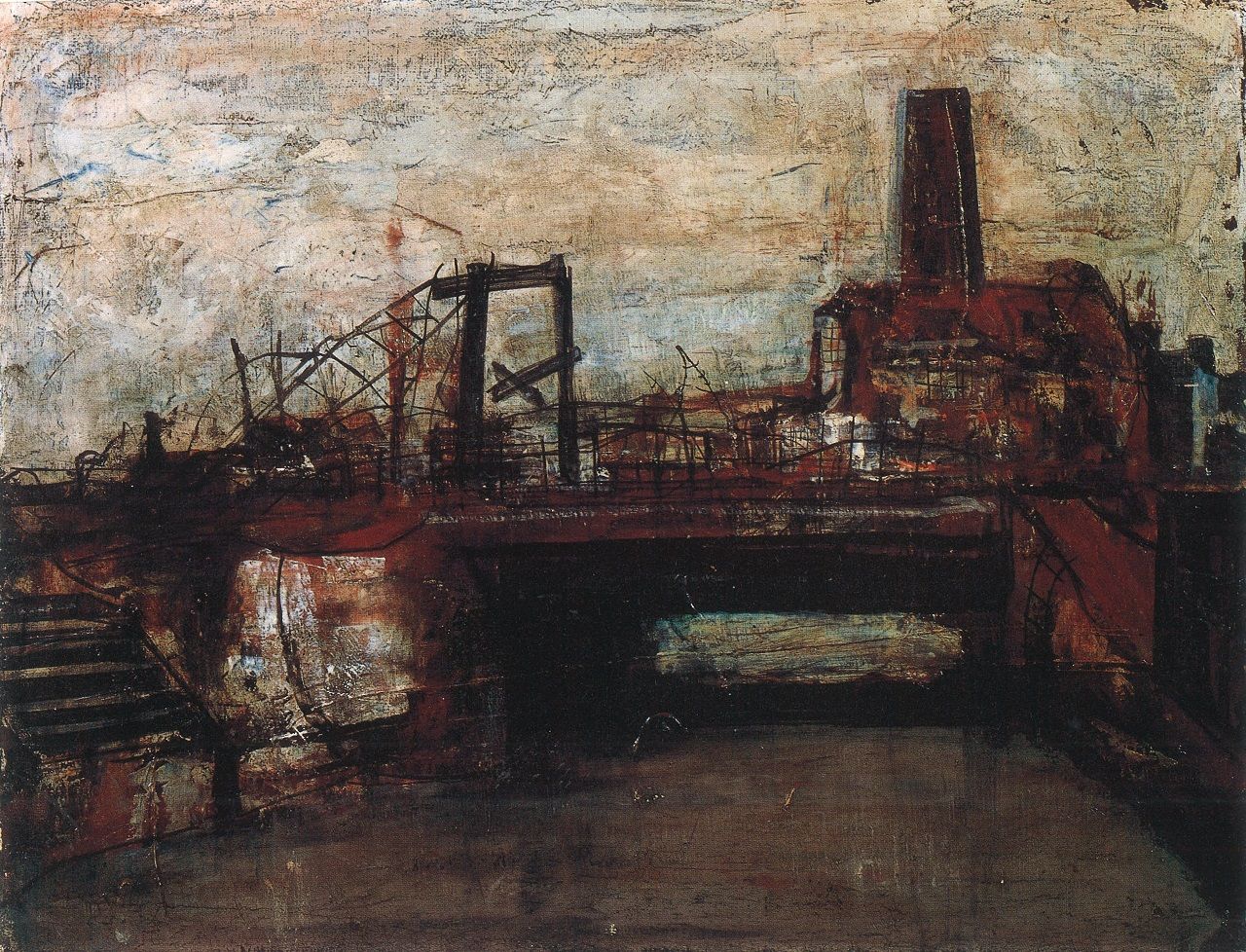 この橋を描いた最後の作品は、空襲を受け、無残にも破壊された跨線橋と橋の姿だった。現実の跨線橋の構造物は破壊され、鉄の焼けた残骸だけが残った。しかし、この時松本竣介の脳裏には、構造物が喪失してしまったその現実とは逆に、新たな跨線橋が、黒く太い線や細い線でイメージされていたのではないか。そう考えてみると、唐突に見える戦後の抽象表現とその構想とが繋がっていくように思えるのだ。