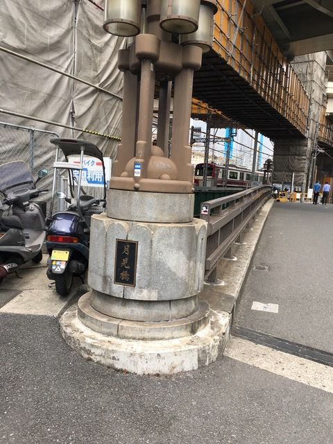 帷子川分水路の表示一方月見橋は人路橋で車は通らない。人の専用橋である。この月見橋の海側に国道一号線が通っているが、こちらの橋は金港橋という名があり、車の行き交う道路橋である。この金港橋から月見橋を望むとちょうど「Y市の橋」の風景に近い視点となる。