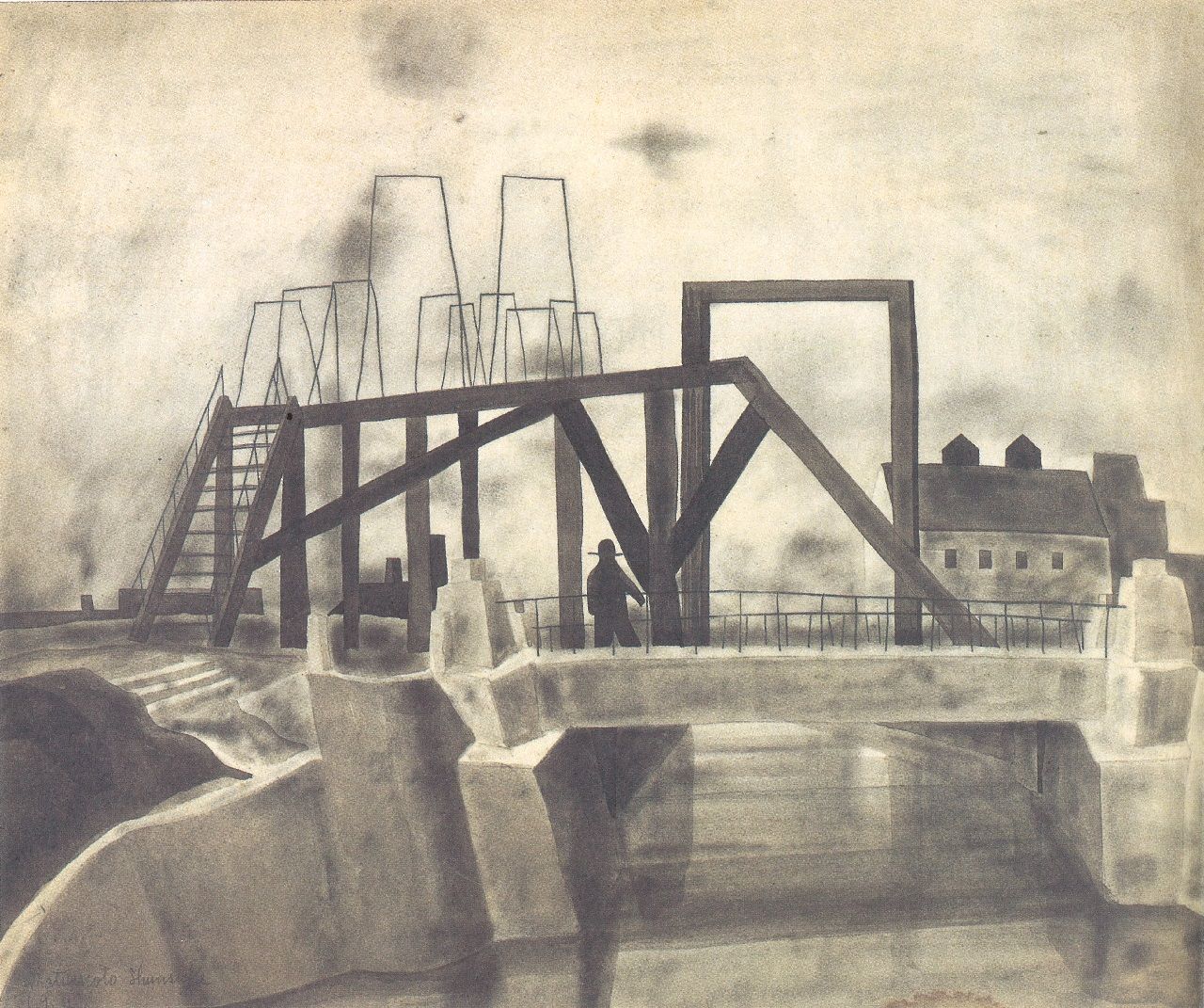 「Y市の橋」の中のモチーフで、中心となる特徴的な造形物はもちろん月見橋と跨線橋だろうか。ここに描かれているのは、ビルのような具体的な建築物の外観ではなく、構成された鉄骨のフレームだ。いわば太く黒い線と細く黒い線の組み合わされた抽象的構造物である。この跨線橋の細い線は、はっきりとした直線として、素描も含めて何度も描かれ、その都度形を変えている。まるでそれは絵画構成の直線を組み合わせる造形的な実験をしているように見えなくもない。この過程の中で松本竣介は、造形要素としての抽象的な形態に興味を抱いたのではないだろうか。もちろん、これだけの理由で抽象表現を試みたのだとは思わないが、きっかけの一つであったのではないかと思う。