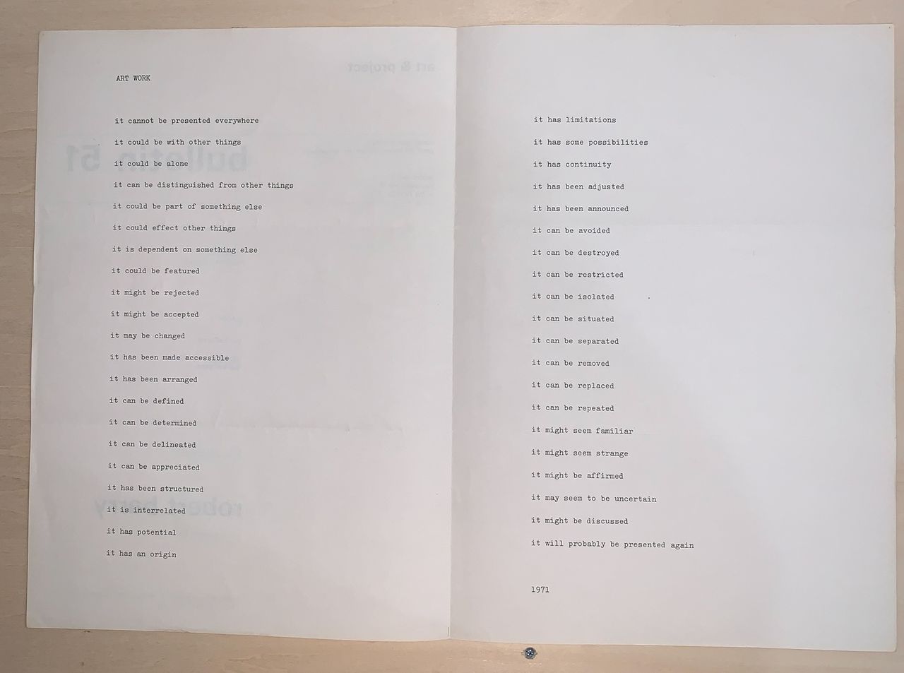 この2ページ、というか、A3サイズのスペースにアーティストが、印刷アートを展開していきました。このブルテン、当初は「本」として刊行されたものではなく、アート・アンド・プロジェクトで開かれる展覧会の案内状として印刷・発送されたものでした。