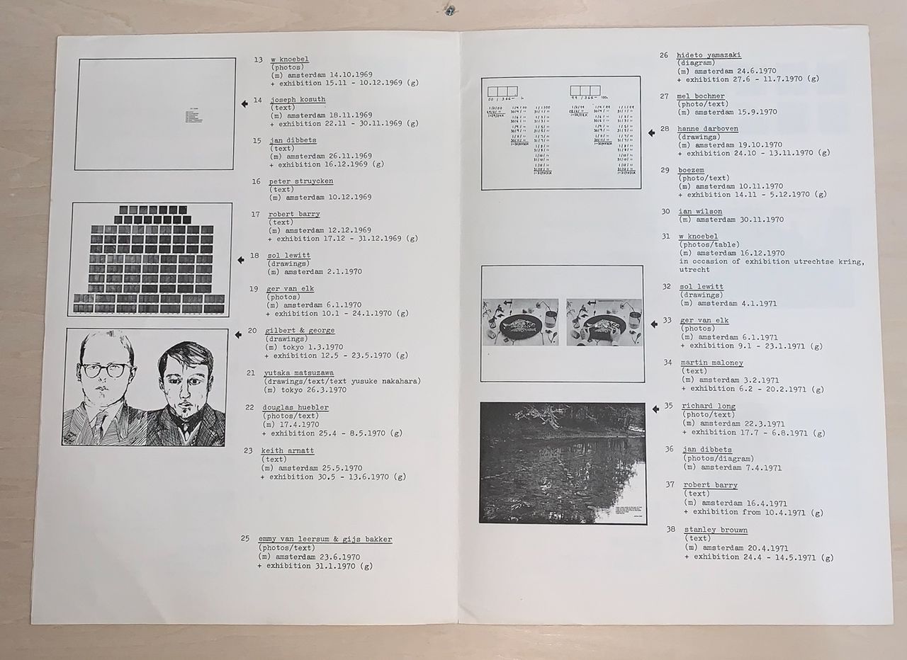 第一号は、1968年9月、ギャラリーのオープン展、シャーロット・ポジェンネンスキ(建築家・デザイナー)に際してのもので、表紙にはアーティスト名、会期などが印刷されています。しかし、見開き2ページは、展覧会に出品される作品の複製や、解説を載せる代わりに作家に託され、紙の上だけで展開される作品となっています。ちなみに、1号から7号までは、建築家、デザイナーの展覧会のために印刷されたものでしたが、69年5月のスタンレー・ブラウン(オランダ在住のコンセプチュアル・アーティスト)展を皮切りに、ギャラリーが主としてミニマル・アート、コンセプチュアル・アートを展示するようになると、ブルテンも印刷技法を用いた作品、アーティスト・ブック的な性格が強くなってきました。