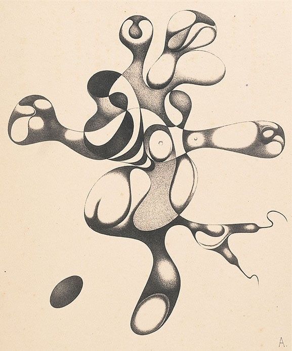 阿部展也作品を初めて知ったのは佐谷画廊での展覧会でのことで瀧口修造との詩画集『妖精の距離』(1932年 春鳥会)のページに印刷されたドローイングによってであった。まだ京橋に画廊があった時だったので、少なくとも1982年以前のことであり、まだ私は大学生であった。瀧口修造に興味をもっていたから札幌から愛知の実家に戻るときに東京に立ち寄って画廊を訪問した際に見ることになったのであろう。そのイメージに魅了されたのを覚えている。阿部のこのときの印象があまりに強かったのか、その後、阿部展也ときくと曲面で構成されたドローイングのイメージが浮かぶようになってしまった。