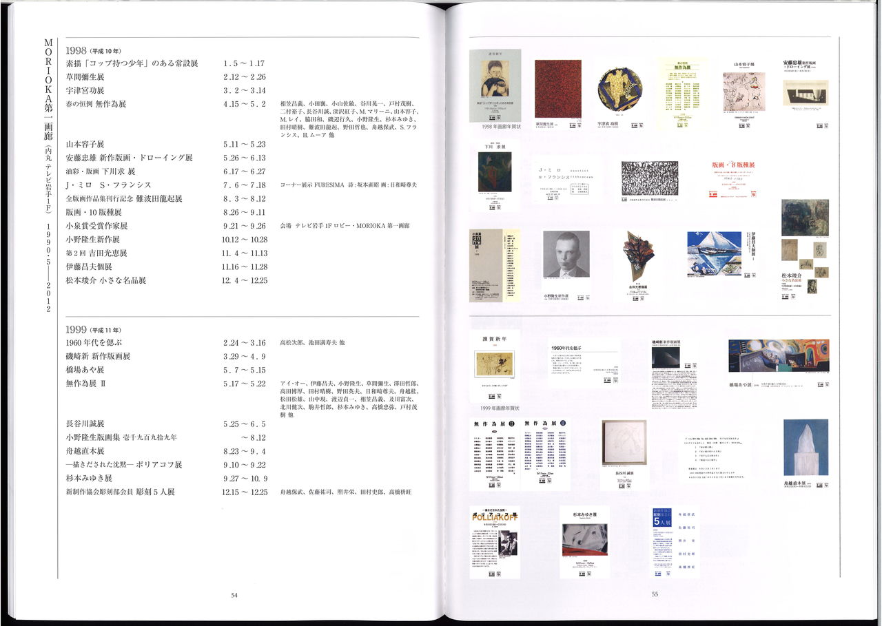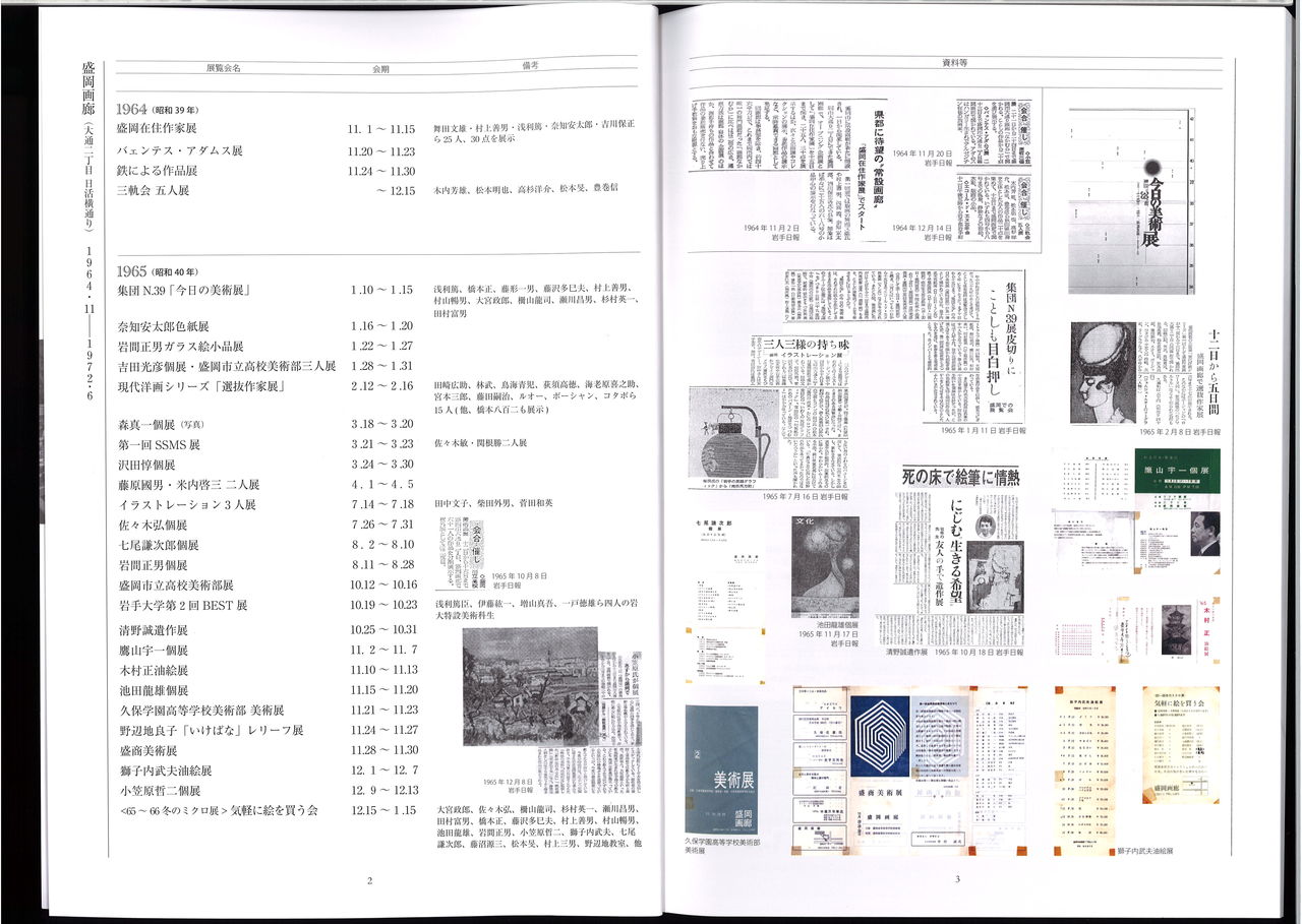 1964年(昭和39)11月「盛岡在住作家展(舞田文雄・村上善男・浅利篤・奈知安太郎・吉田保正ら25人展)」から、2017年7月「宇田義久展」まで、同画廊で開催された展覧会の全記録が収録されています。