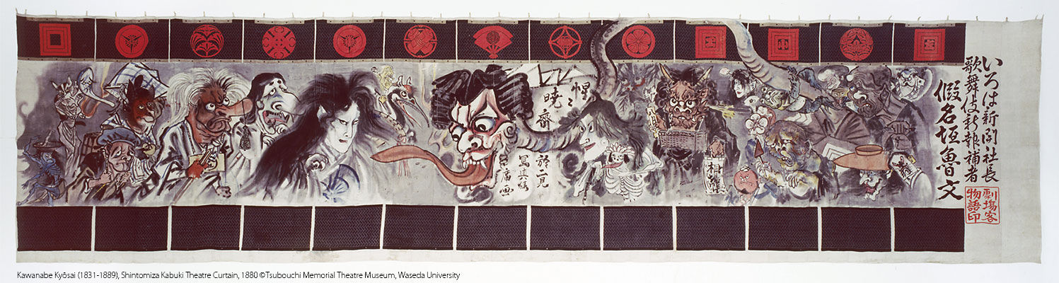 制作されてから130年以上が経ち、国外での展示は今回が最後だと言われている河鍋暁斎の「新富座妖怪引幕」(早稲田大学坪内博士記念演劇博物館蔵)