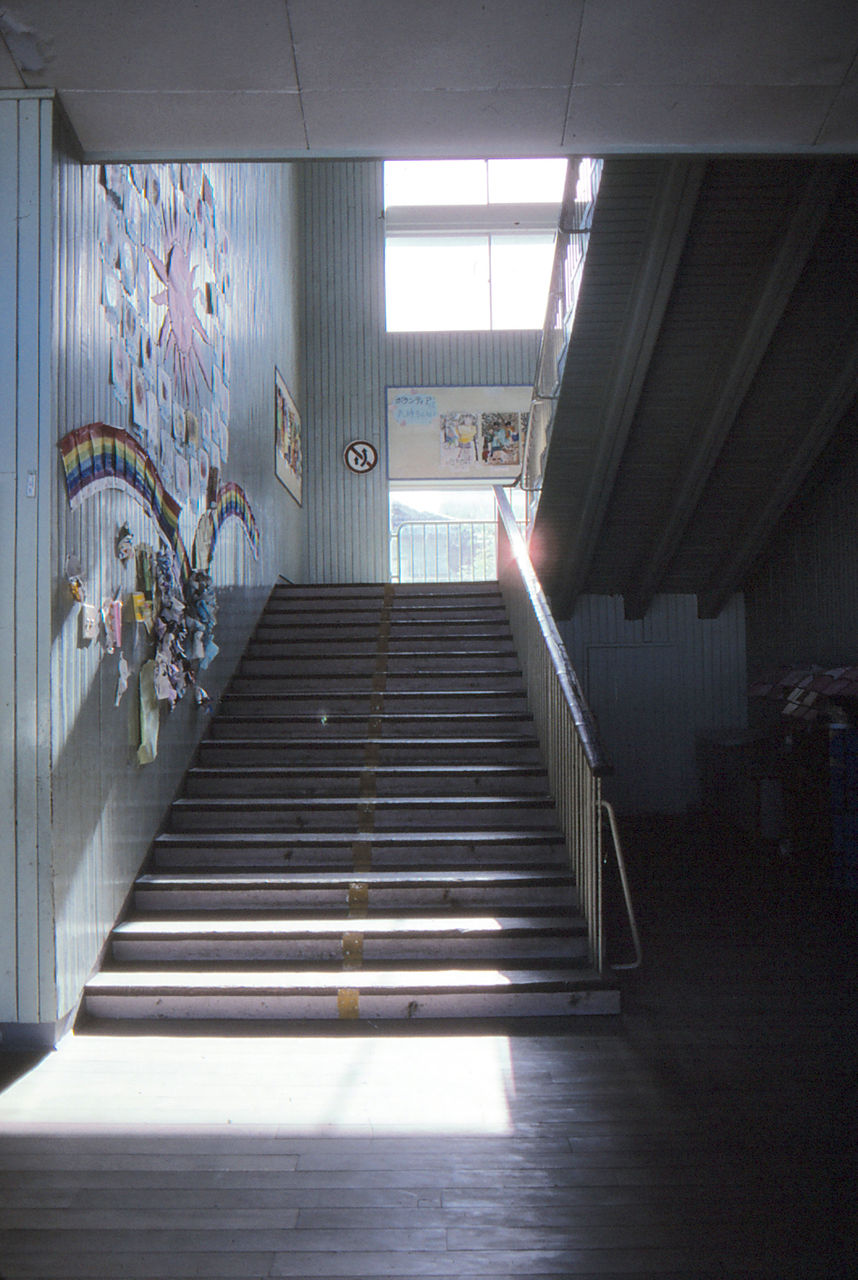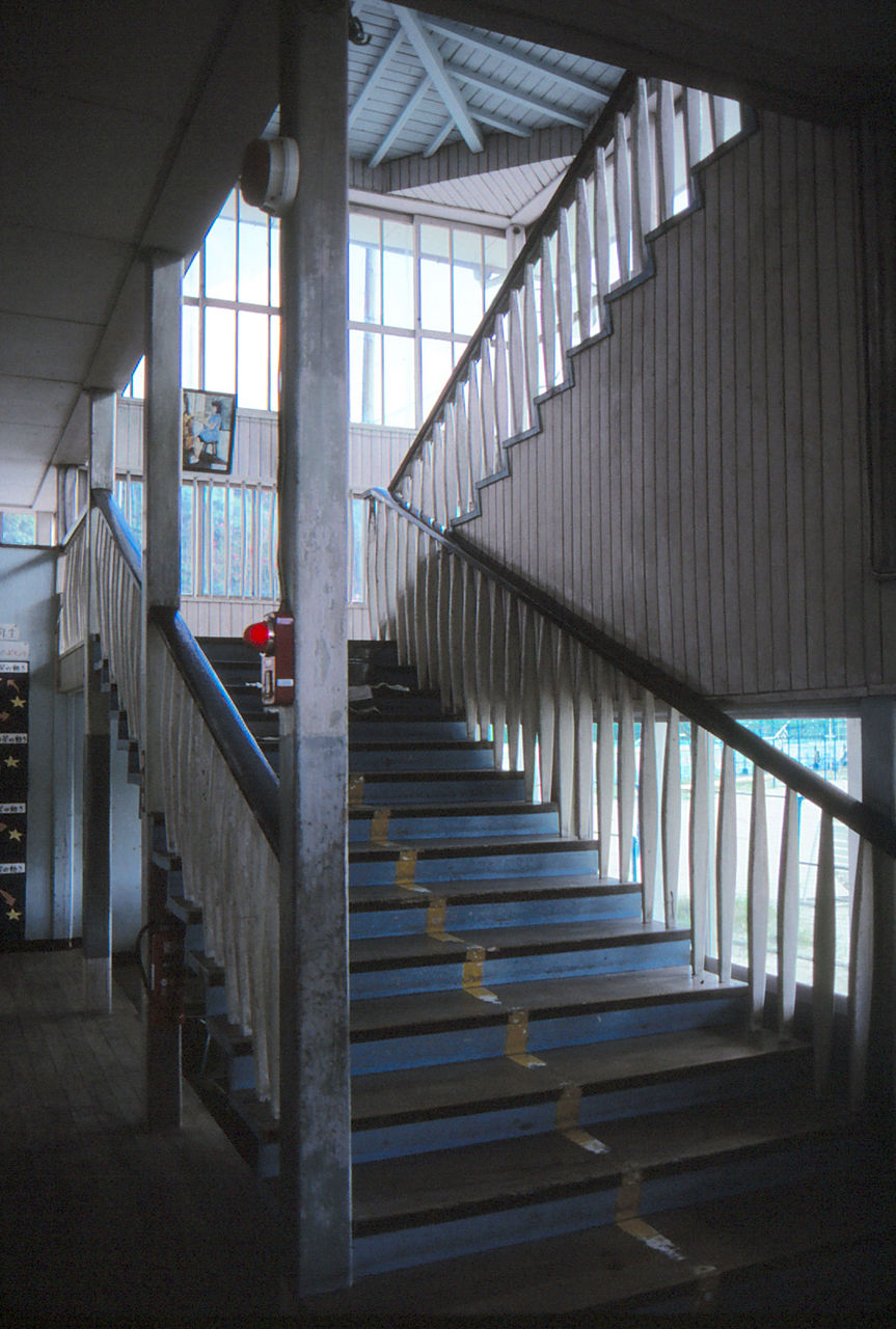 特別教室棟階段8月19日には八幡浜市役所を再訪し、かつて松村の部下として設計に従事した柳原亨さんと、建設課に勤める清水行雄さんにお目にかかった。そして、市役所に保存されている松村が設計した全ての建物の設計原図を借り、松山の専門業者に持ち込んで複写する許可をとった。いうまでもなく、これがその後の分析作業の基礎資料となった。