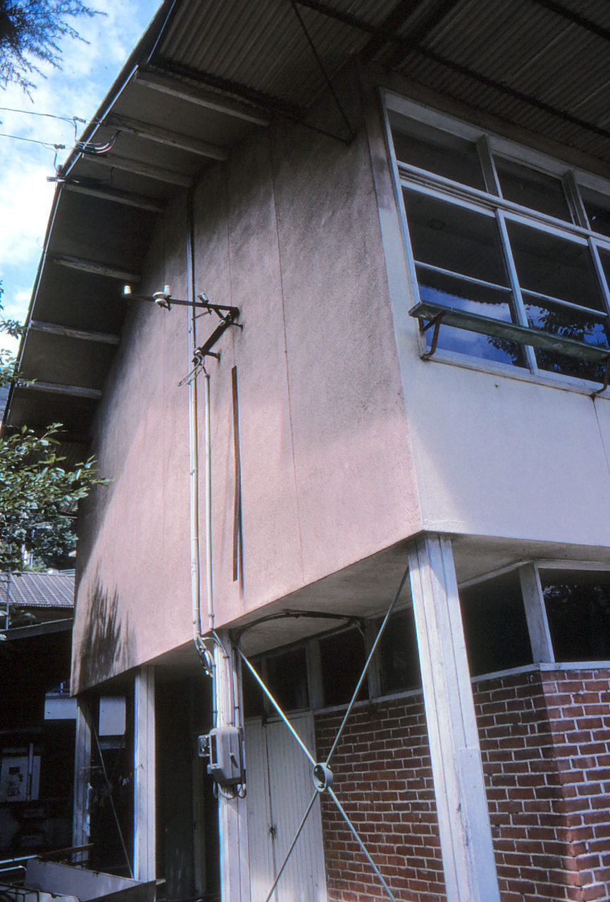 実はこの建物は、1951年に市内の別の場所(新川沿いの中心部)に建設され、その後、1954年に現在の場所の近くに平面形を左右反転させて移築され、さらに1971年に現在の場所へ再移転されたのであるが、そういうことがわかるのは、後に2種類の設計図が残っていることに気がついてからである。また、建築基準法の改正にともない、防火上の理由で外壁がモルタル・ペンキ塗りになった最初の松村担当物件で、日土小学校などの松村流デザインの出発点といえることも、その後に気がついたことである。
