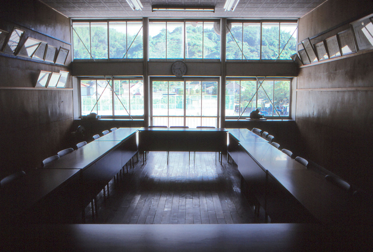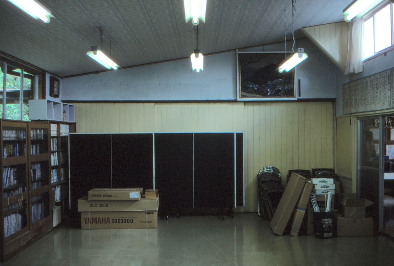 図書室。改修前はこのような状態で、生徒会室として使われていた次に皆で、長谷小学校(1953年完成)を訪れた。複式学級が前提の小さな学校で、松村が木造平屋の校舎を設計した。宇和海を見下ろす標高300mほどの山の上にあり、周囲にある蜜柑農家の子弟のための学校だった。たいへん細い道を登るので、曲田先生の車の先導のもと、こわごわ車を運転した。