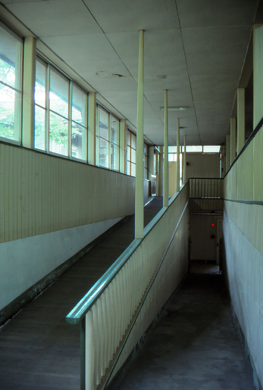 中校舎と東校舎を結ぶ2階廊下のピロティ。柱は65mmのアングルという繊細なデザイン。法的な必要から改修工事で作り直した