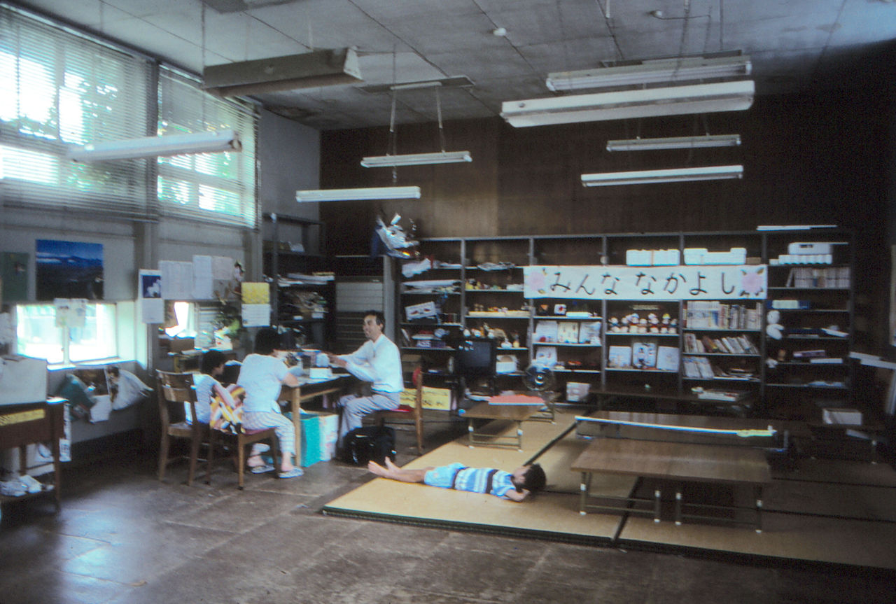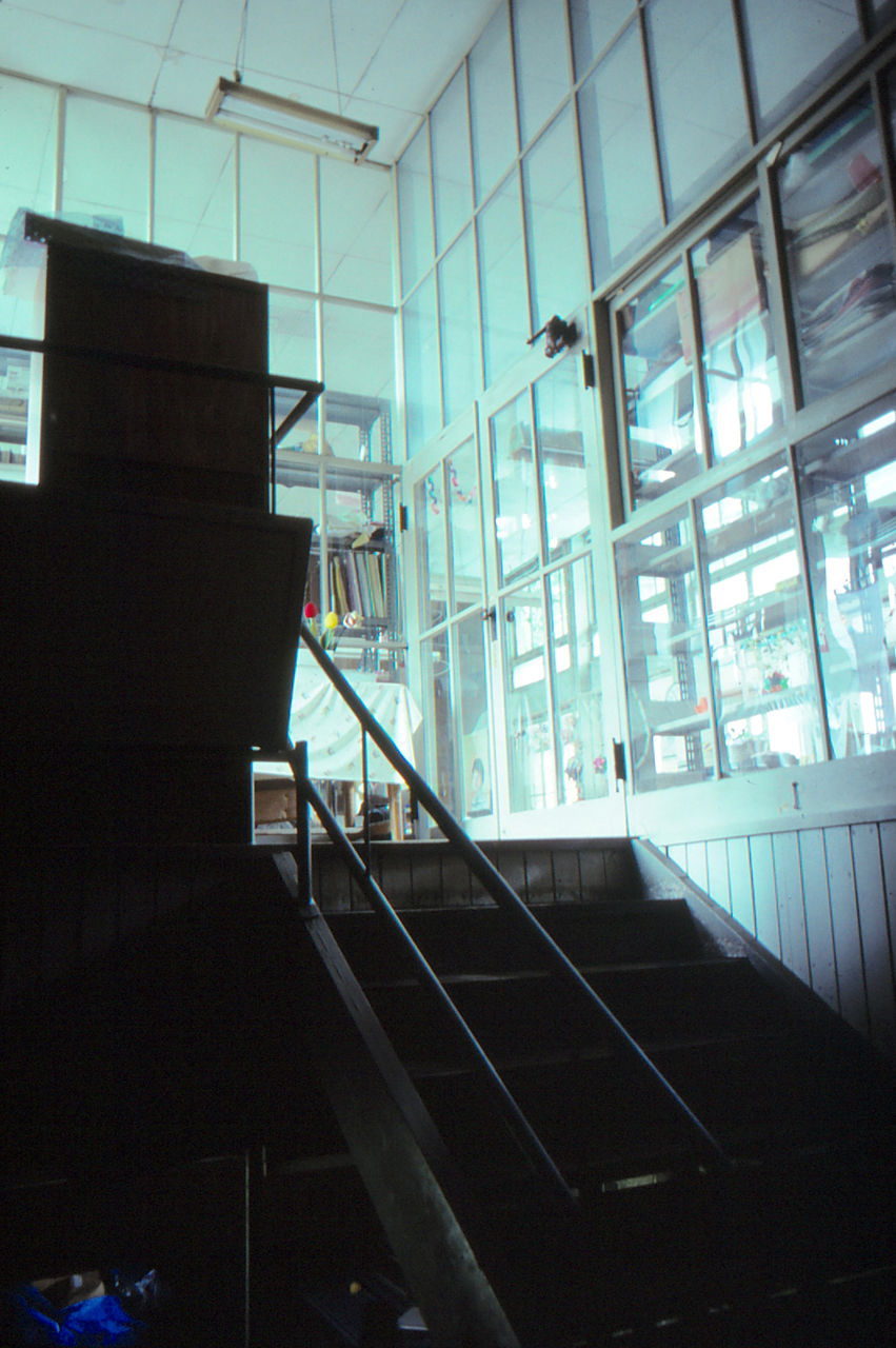 1階は物置と化していた。柔らかなデザインの階段で2階にあがると、木製枠の大きなガラススクリーンがあり、その奥がもとの閲覧室だった。書架はすでになく、一部に畳が敷かれ子供が寝転がっていた。