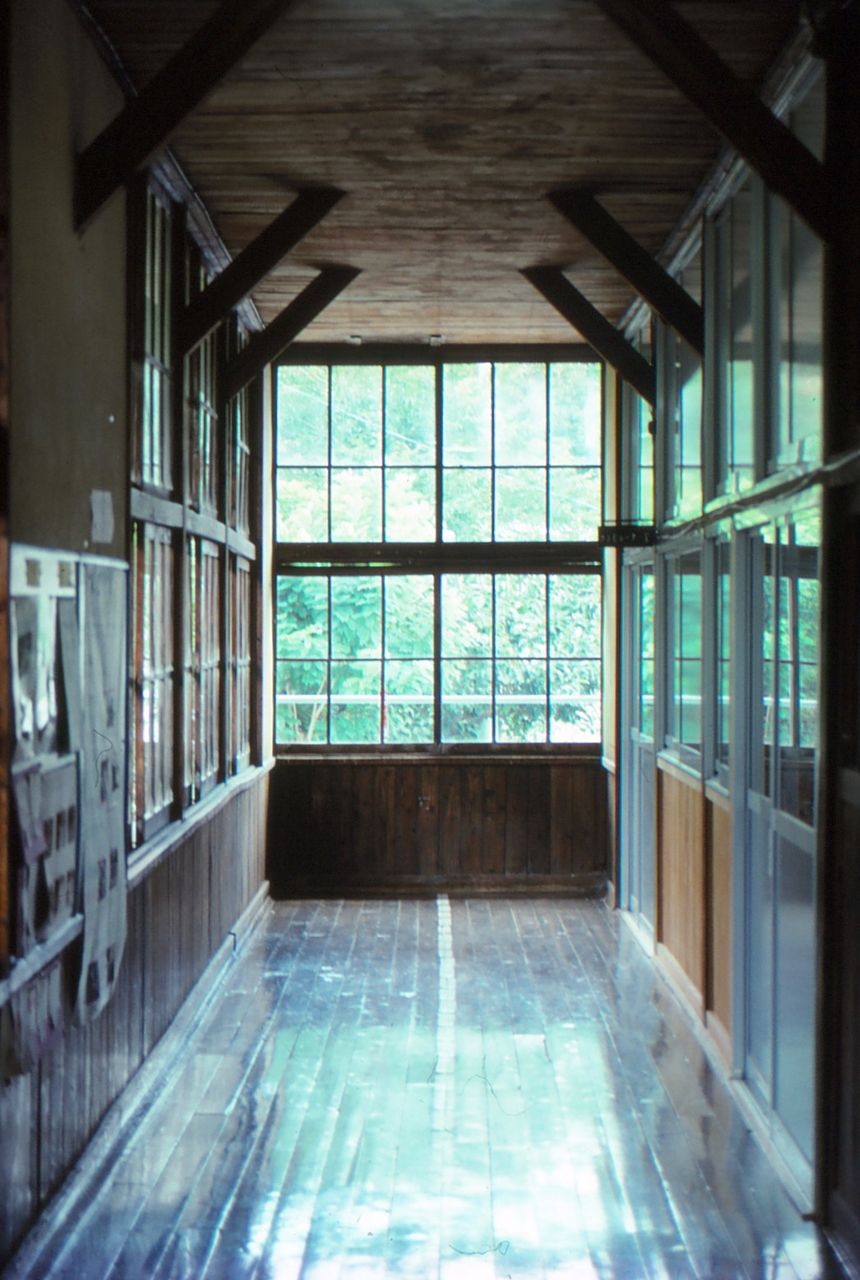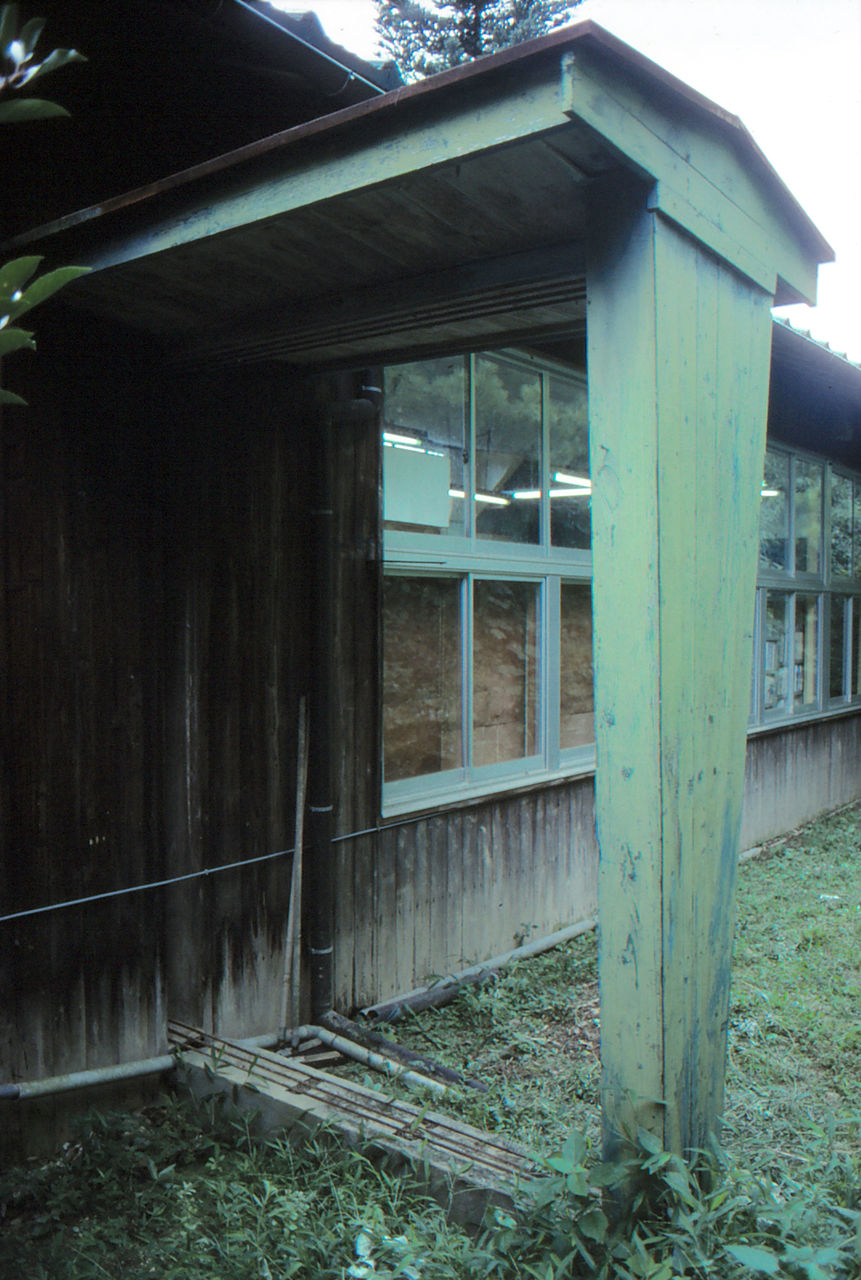 裏側の出窓部分また、川之内小学校にもこのとき初めて行ったと思う。松村の設計で1950年に完成し、彼が設計し現存する最も古い建物である。こちらは懐かしの木造校舎という雰囲気だった。しかし、トンネルのような通路を通って裏側に抜けると様相は一変し、複雑な構成の吹きさらしの昇降口と水平連続窓の美しさに驚いた。しかしそれらの意味、つまり、日土小学校で完成した教室への両面採光の初期の試みであることがわかったのは後のことである。