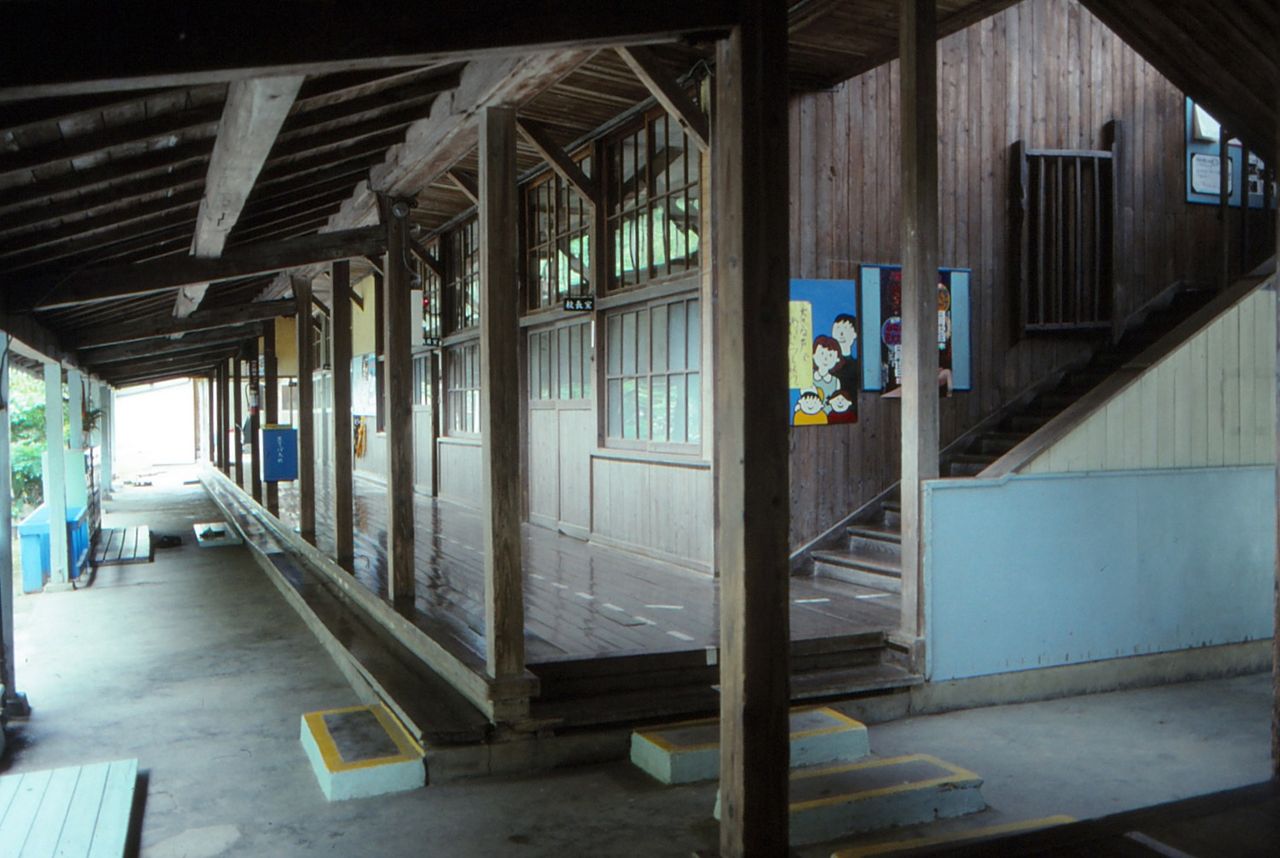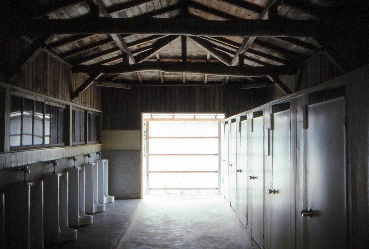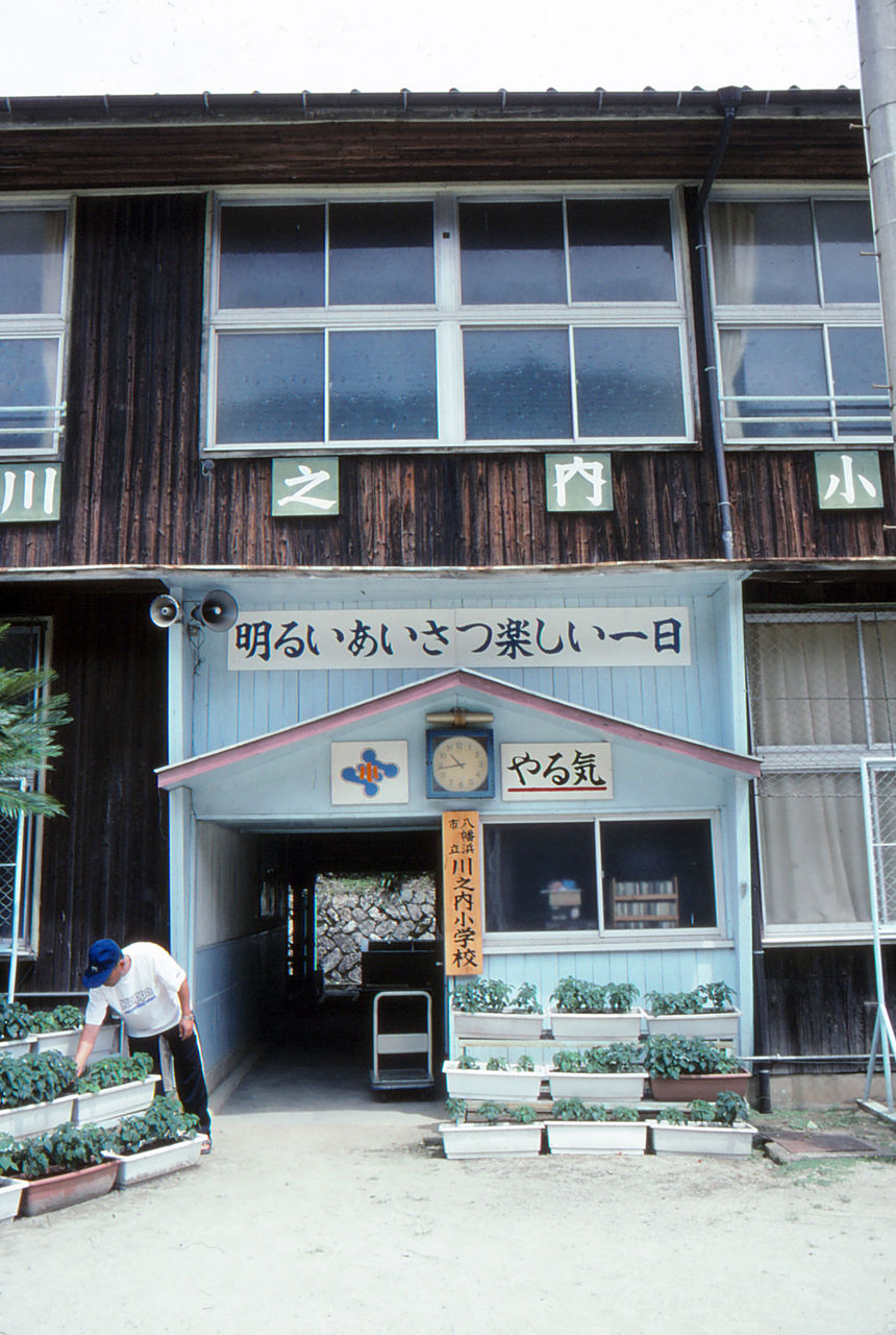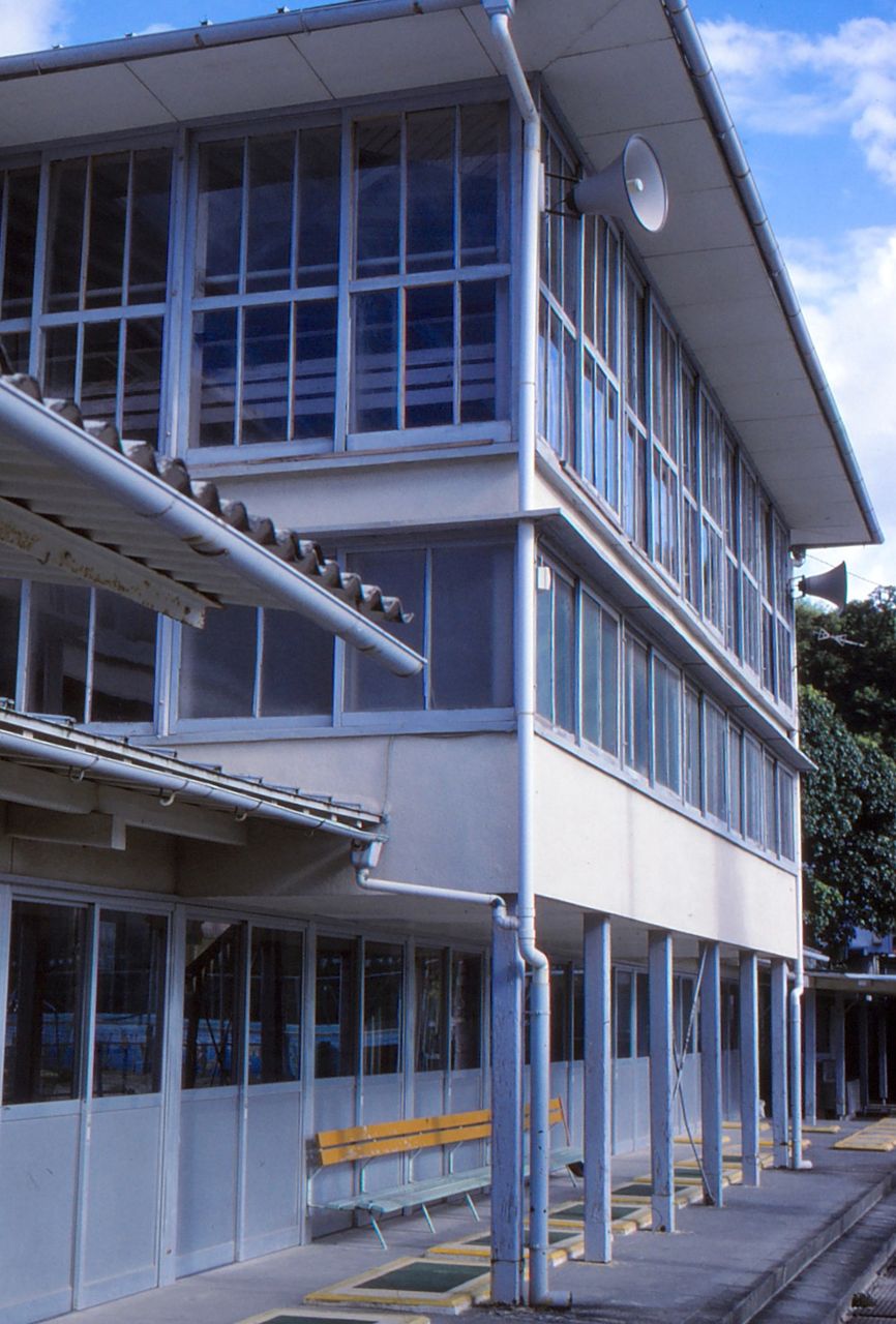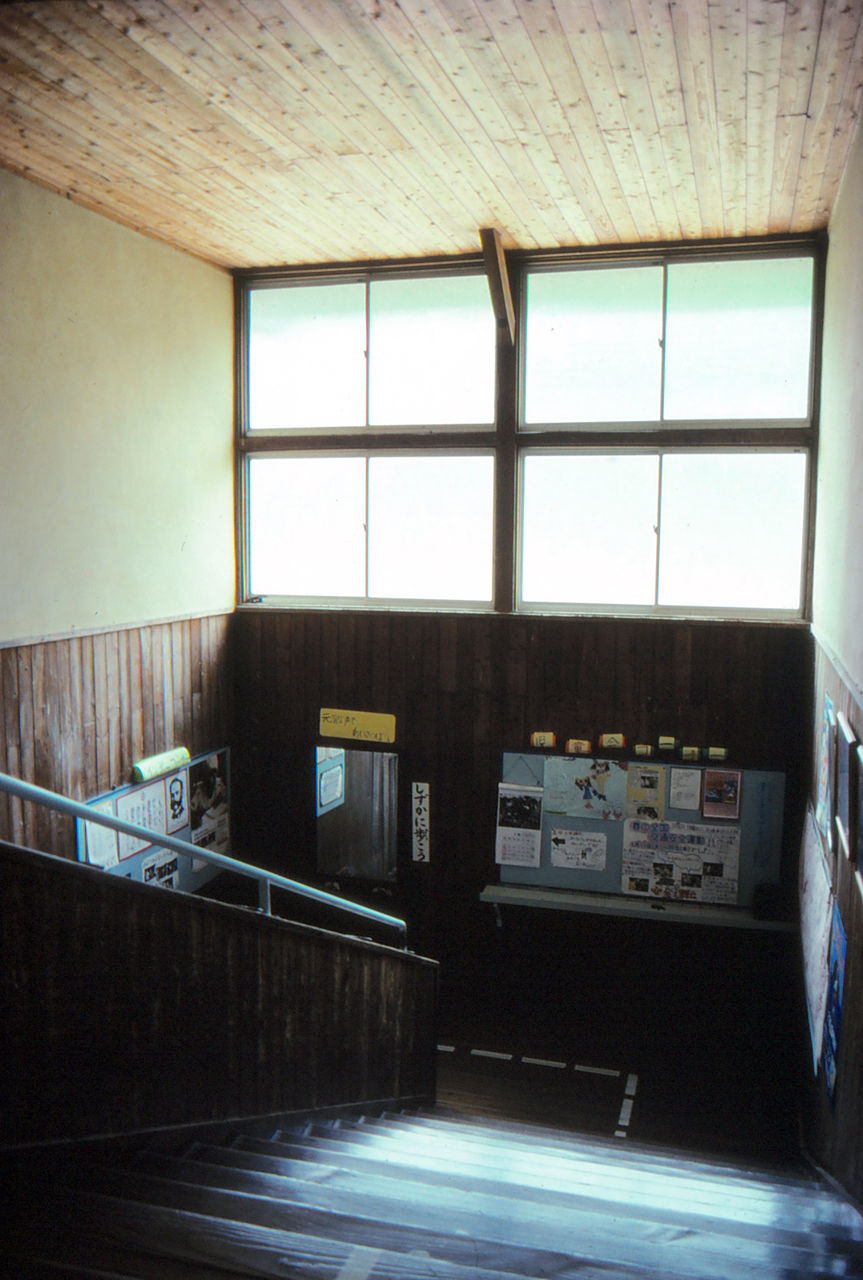 また、川之内小学校にもこのとき初めて行ったと思う。松村の設計で1950年に完成し、彼が設計し現存する最も古い建物である。こちらは懐かしの木造校舎という雰囲気だった。しかし、トンネルのような通路を通って裏側に抜けると様相は一変し、複雑な構成の吹きさらしの昇降口と水平連続窓の美しさに驚いた。しかしそれらの意味、つまり、日土小学校で完成した教室への両面採光の初期の試みであることがわかったのは後のことである。