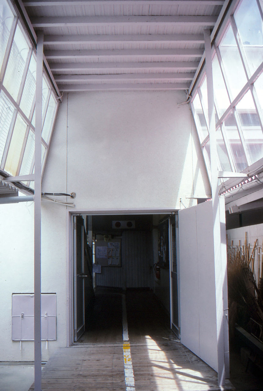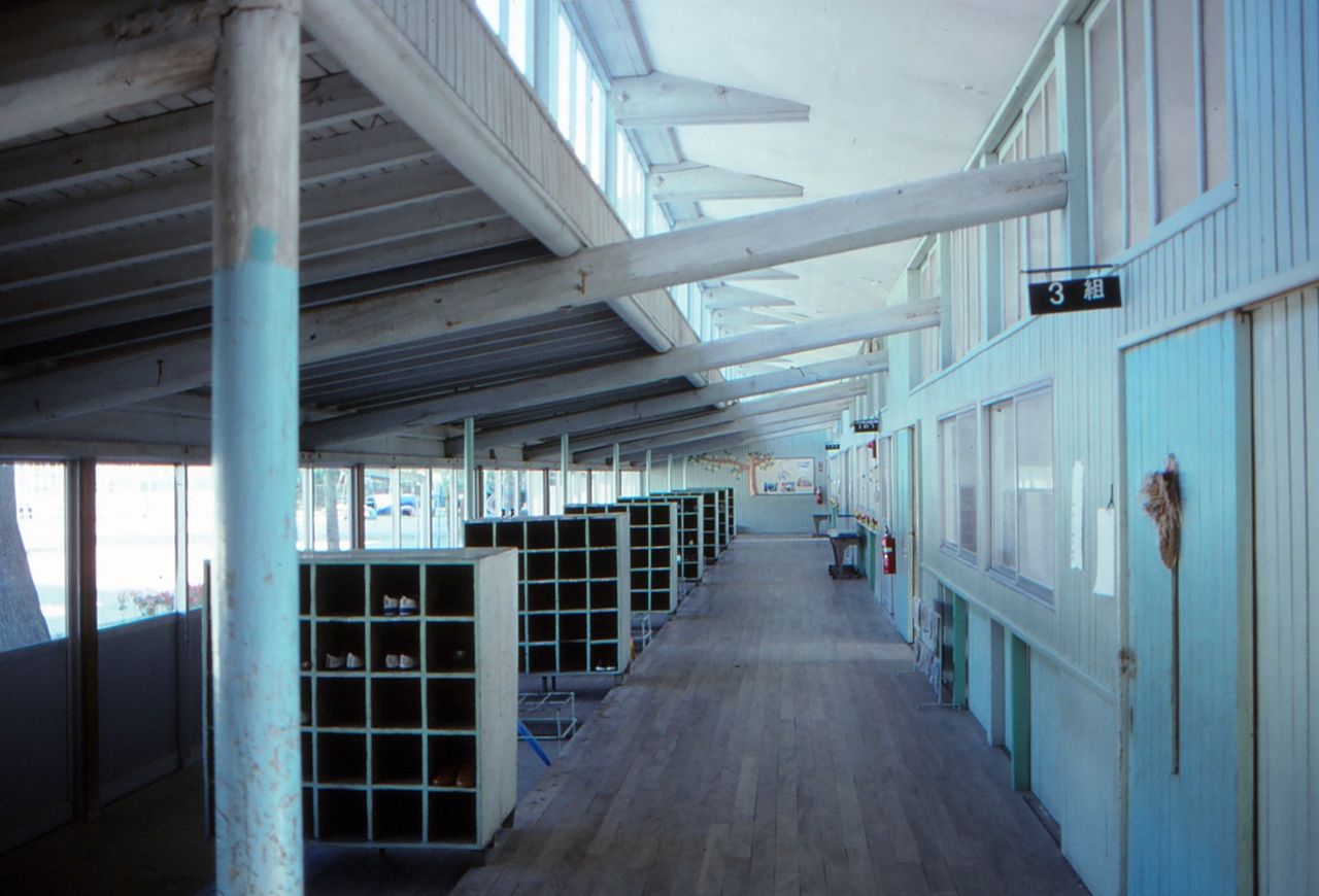 東校舎の昇降口。後付けの手洗いは撤去し、その上部の屋根のトップライトは復活させた