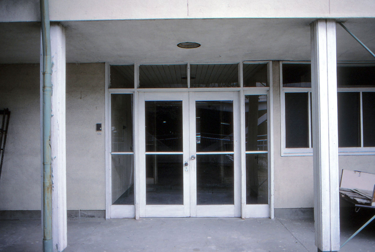 中校舎の職員室の廊下側の壁。改修工事でガラススクリーンに変更した