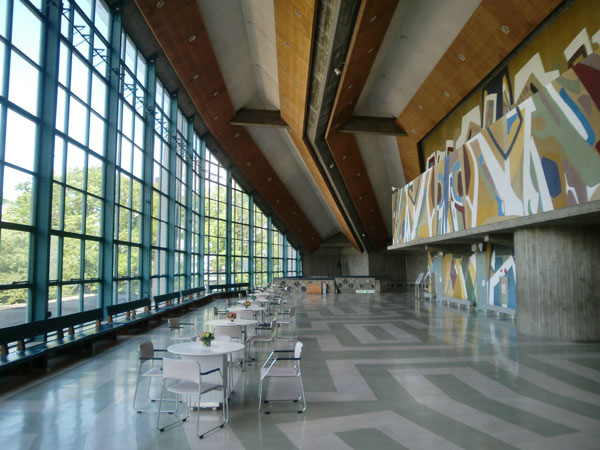 日本に於けるモダニズム建築の代表作の一つであり、構造形式は最大スパン60mの鉄筋コンクリート折板構造で、内部は地下1階・地上2階で構成されています。竣工の前年1960年創立のTMOにとってはホームグラウンドともいうべき場所であり、多くの思い出がつまっています。