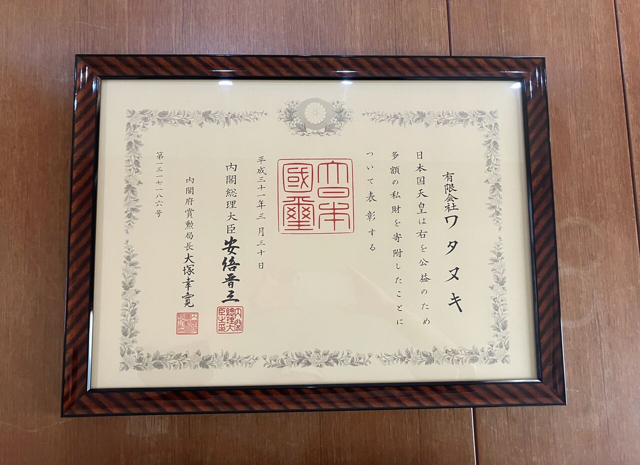 建畠晢館長(左)から紺綬褒章を受ける綿貫令子