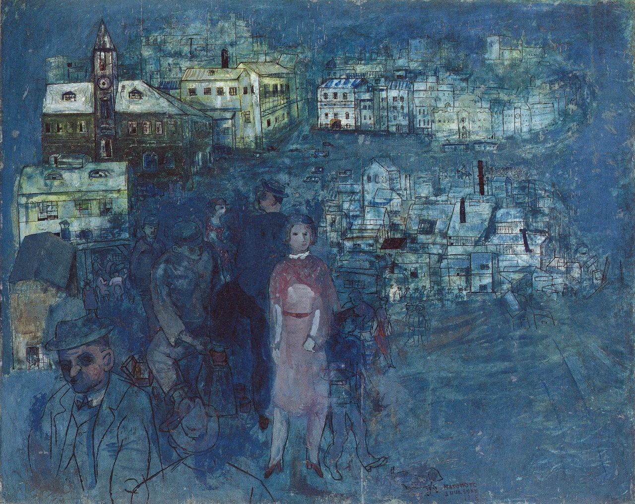 そして1938年第25回二科展に代表作のひとつ『街』が発表された。周知のようにこの作品は「建物」と「人物」がひとつの画面でモンタージュされたものである、ふたつのモチーフ、すなわち背景に描かれた都会風景の建物群である「建物」と、線描によって描かれた都会に暮らす人々という「人物」が統合されてひとつの画面に表れている。