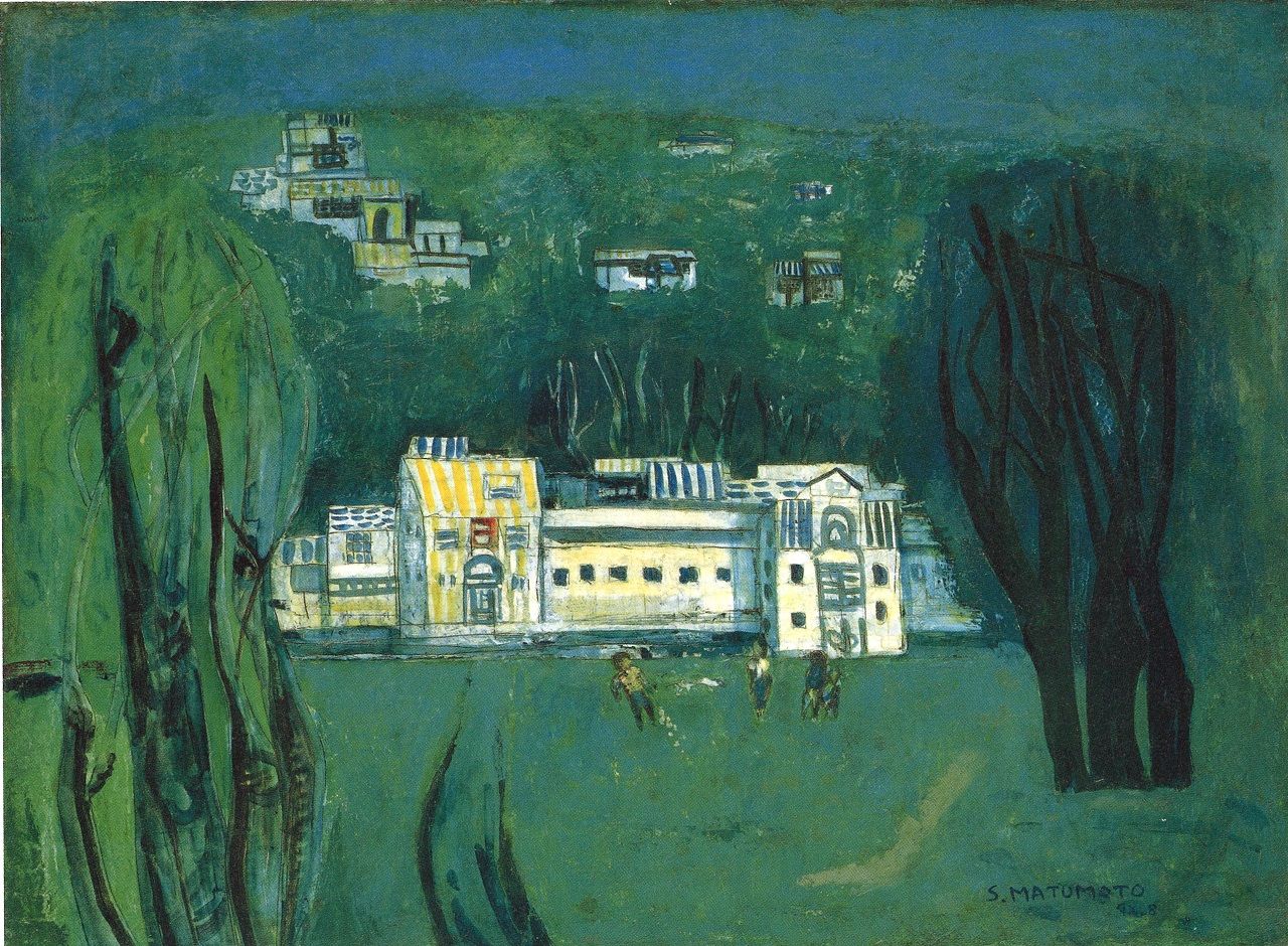 余談だが、この時、建物の縞模様に使われている黄色という色は、松本竣介の絵画に使われているのを滅多に見たことのない色でしかも原色に近く、非常に珍しいものだ。同様な構図の作品は1938年1月の年記のある同じタイトルの作品『郊外』があり。ここには赤の原色に近い色も見える。これも珍しい色使いである。