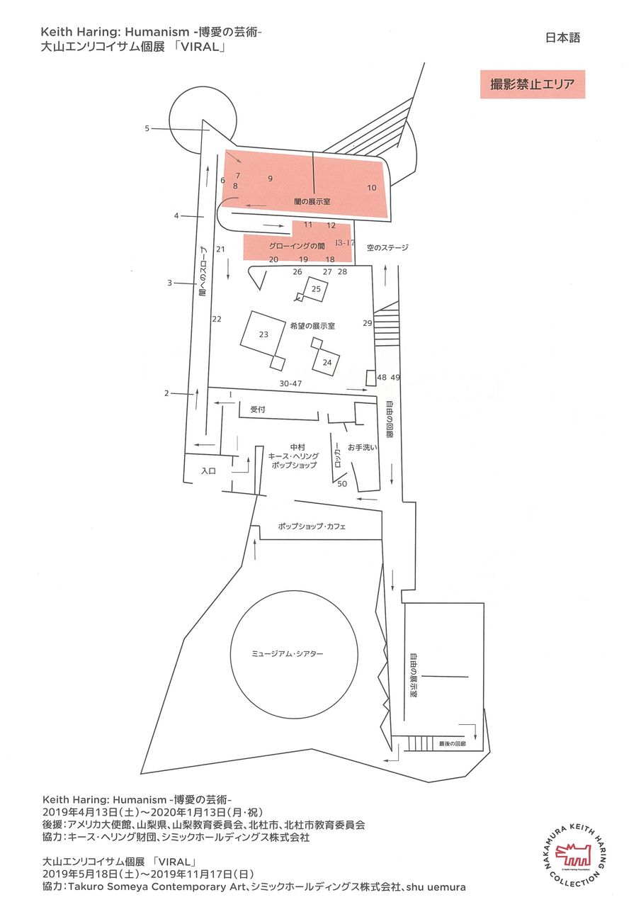 山梨県の小淵沢にある中村キース・ヘリング美術館で、2019年度通年の所蔵品展「Keith Haring: Humanism -博愛の芸術-」と5月18日~2019年11月17日の企画展大山エンリコイサム個展「VIRAL」が行われている。ここ数年、渋谷区宮下公園の整備、各市町村と東京23区の落書き防止条例の強化など、都市をクリーンにするための規制が増える一方で、エクストリームスポーツやストリートアート作品への関心とストリートアート系イベントの増加が見られる。今回、80年代にストリートアートを牽引したキース・ヘリングと現在活躍中のグラフィティに端を発する大山エンリコイサムの作品を中村キース・ヘリング美術館で観た。シングルストロークの単位とそれらが広がって創られる彼らの絵画の世界と、外部に視覚的に現れる多元的な構成要素が結びついて、空間内部での体験につながっているこの建築は、共通してまるで夜空に描かれた星座とそれらで編まれた物語を読むようなものだと感じたので、ここに記しておきたい。