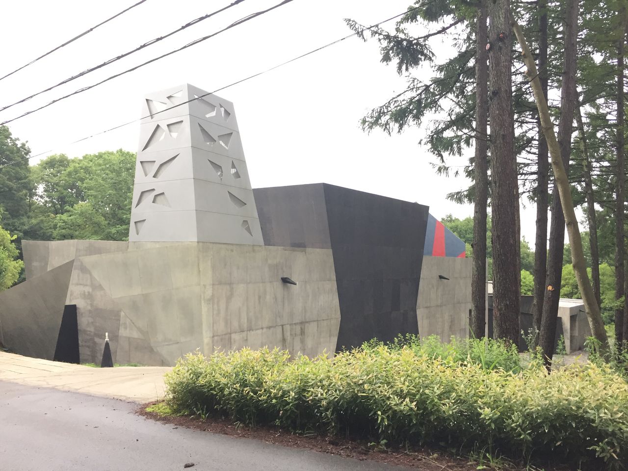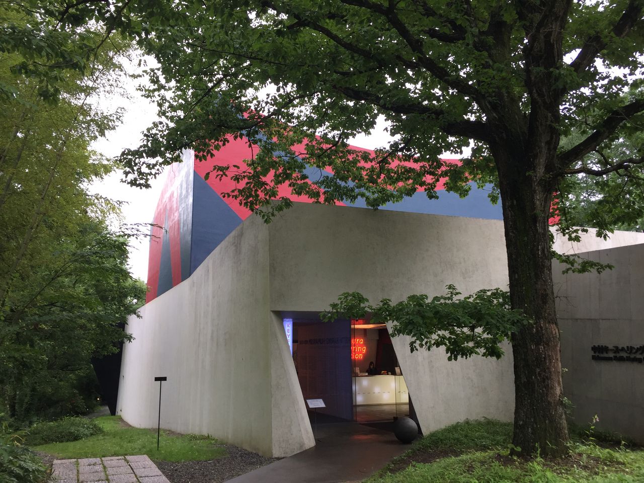 実際に完成した美術館での、前述の多様な身体的体験を支えているのは、森の緩やかな地形に逆らうことなく建てられていることが挙げられる。また、外観から読み取ることができる倒立円錐、懸垂曲面、円錐といった構成要素、つまり地上に隆起した形状が、内部空間を裏切らないことが挙げられる。ところが、これら外観に表れる幾何学形態や、天井や壁に空いたさまざまな台形の孔、内装に使われているビニールの幕やトイレの柔らかい扉、2015年の増築で登場したギザギザの外壁、円形の中庭といった形も色も素材も異なる要素同士の繋がりは一体どう説明がつくのであろうか。誤解を恐れずに言うとバラバラの要素の混成体のために、増築に違和感をもたらしにくい形態にさえなっている。