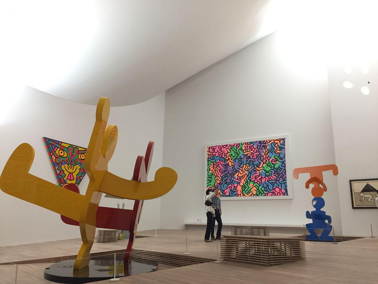 次に進むと「グローイングの間」。ここは広めの斜面になっている幅のある通路のような空間で、80年代前半にニューヨークの地下鉄で行われた「サブウェイ・ドローイング」の頃の資料を展示されていた。短時間で描け、日常的な公共の場でのコミュニケーションとして情報をわかりやすく伝えるためにモチーフは単純化されていった。続いては「希望の展示室」。天井も一段と高く、敷地の地形に沿って床が傾斜している展示室で、三次元の懸垂曲面の天井により空間の隅々まで光が均等に拡散されている。天空のような光と心地よい床の勾配が屋根の上にいるような錯覚を生む。ここでは80年代後半の大型の立体作品とシルクスクリーンがのびのびと展示されている。つづいて「自由の回廊」。開館当初は冒頭の倒立円錐の展示ブースと対をなす正立円錐で一連の物語が完結していたが、2015年以降に増築された「自由の回廊」から繋がる「多目的展示室」で企画展「VIRAL」展が開催されている。敷地に対して上りの傾斜なので、展示室が段床状になっているのも特徴だ。このように、一筆書きの明快な動線でありながら、多様な身体的な体験をするポエティックな建築がこのミュージアムだ。