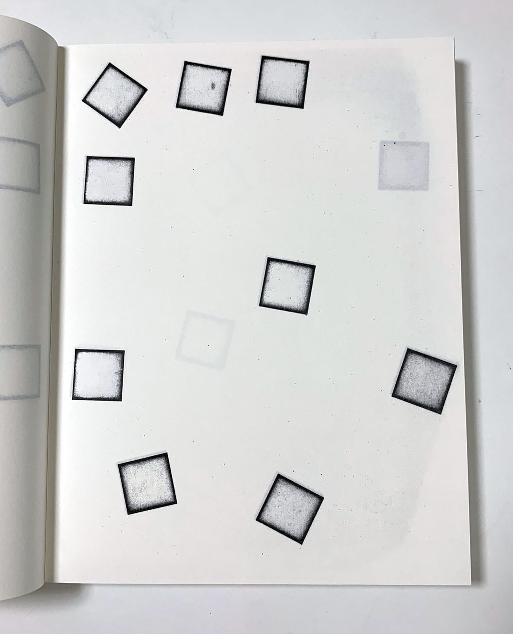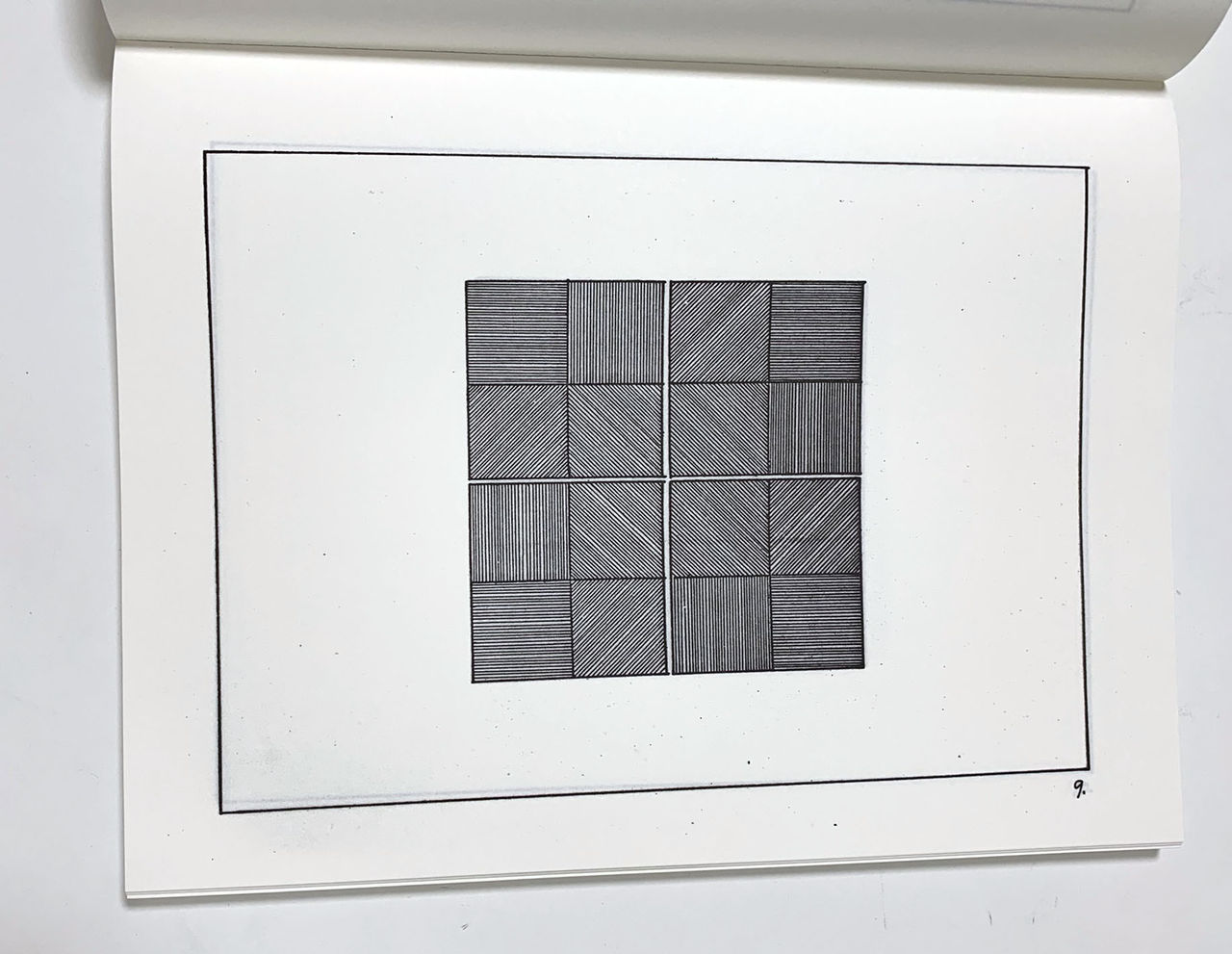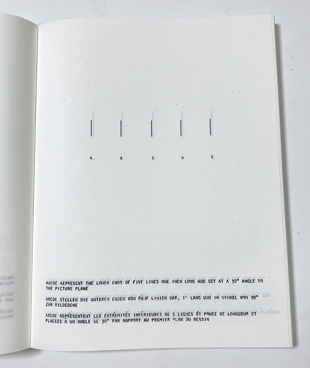 さらに、企画の意をくんだ作家たちの多くは、25頁を制作する段階でも、ゼロックスを使っていたように推測できます。ヒューブラーやコススの作品は、画面の上に点や線とキャプション、そして短文を配し、共に頁をめくるごとに展開していく形式のもので、制作の段階では、作家によるゼロックス独自の機能に利用はなかったように思われます。また、ソル・ル・ウィットの、縦、横、斜めの線で埋められた矩形の組み合わせを展開していく作品も、制作の過程でゼロックスを使用したかは判断できません。しかし、本の制作の段階でゼロックスが使用された際に生じたと思われる線の掠れは、この作家の他のアーティスト・ブックにはない味になっています。もっとも、作家自身が意識していたかは判りませんが。