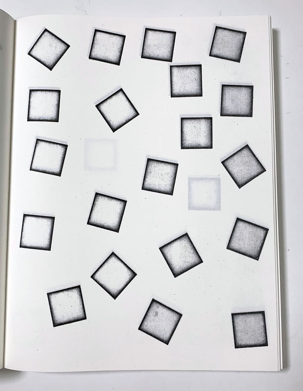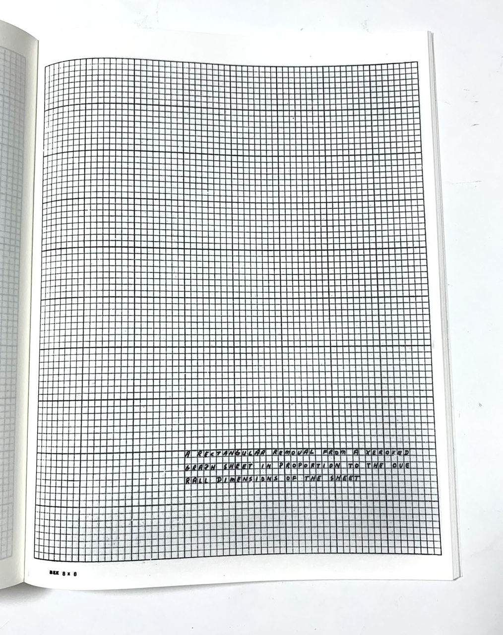 ソル・ル・ウィット残り4作家の作品は、制作の段階でのゼロックスの積極的な使用を感じさせます。アンドレの作品は、1インチ四方の矩形が、1頁目には1個、2ページ目には2個・・・25頁目には25個配置されたものです。コピー機の上に矩形の板か何かを置いて、それをコピーして製作したのではないかと思われます。