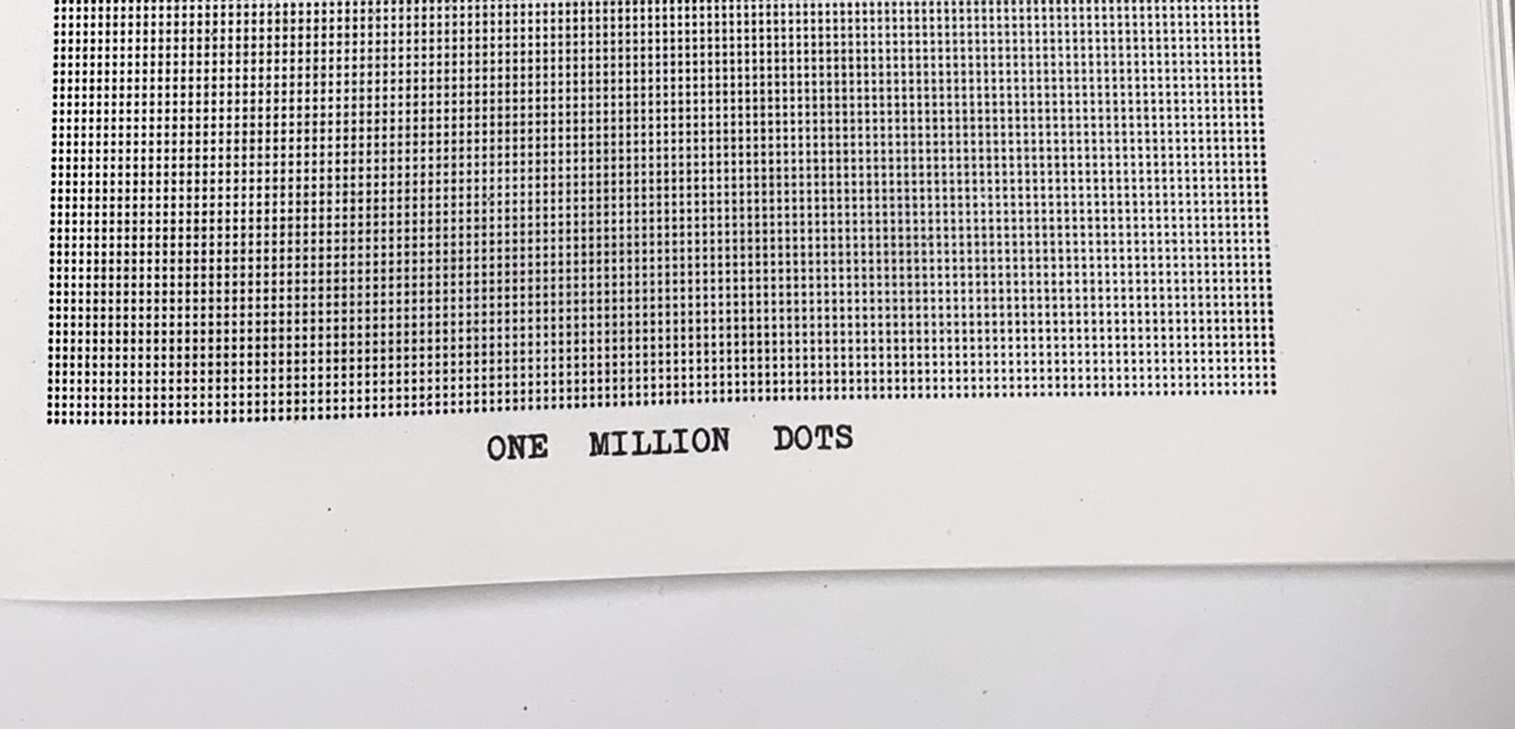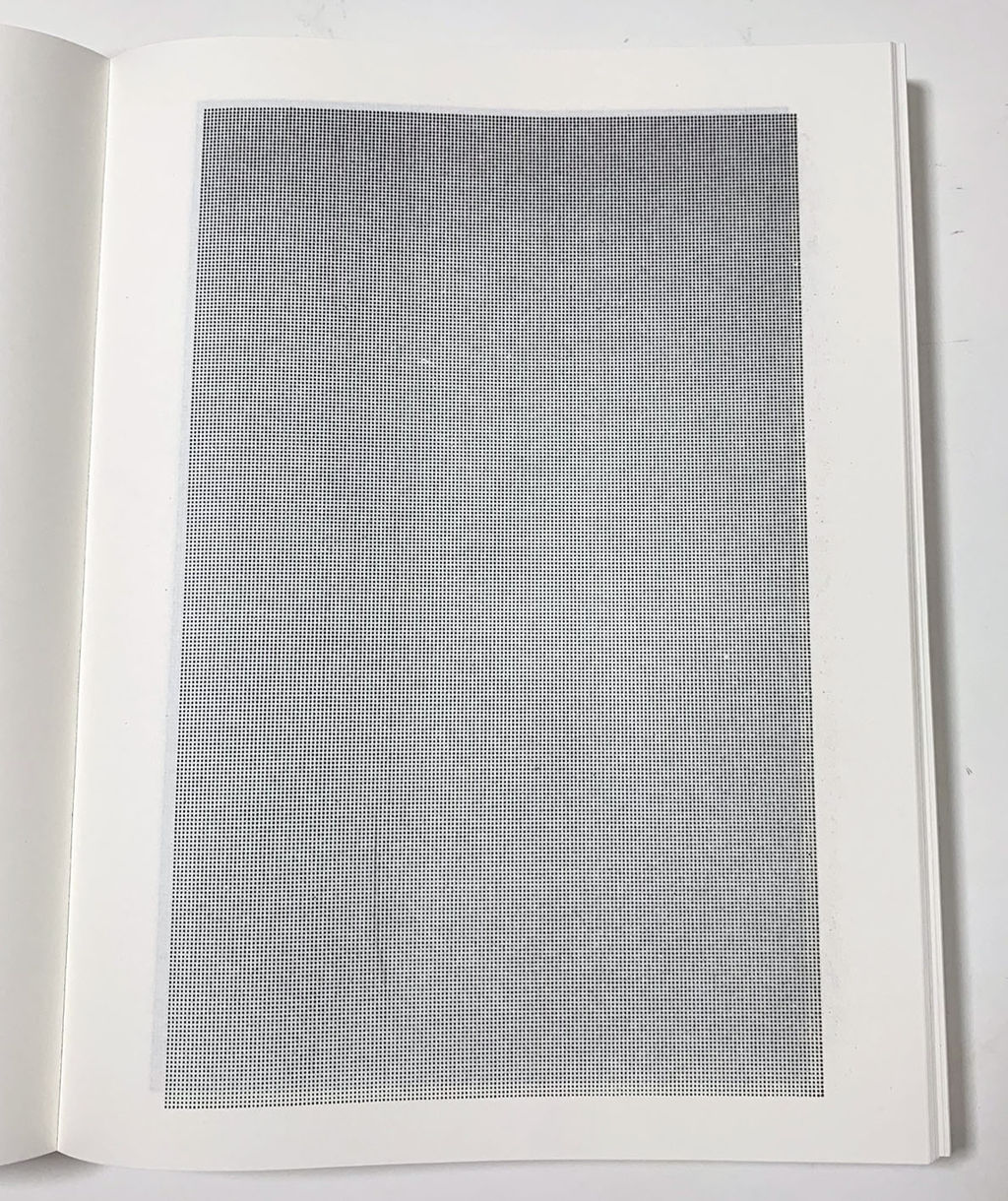 バリーの作品は、ボタンを一押しすれば、複数のコピーが短時間でできるという、コピー機の特性を利用したものです。1頁目から無数の点が矩形に配置された頁が延々と続く作品で、25頁目の余白にだけは「100万のドット」と記されていることから、そこに辿り着いた時点で、それまでの各ページに 4万個の点があったことが判る仕組みになっています。
