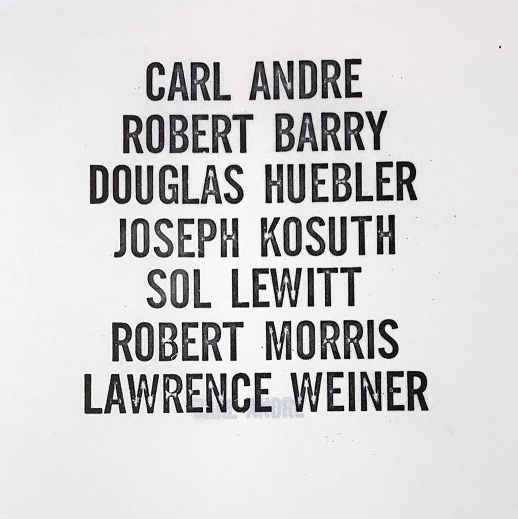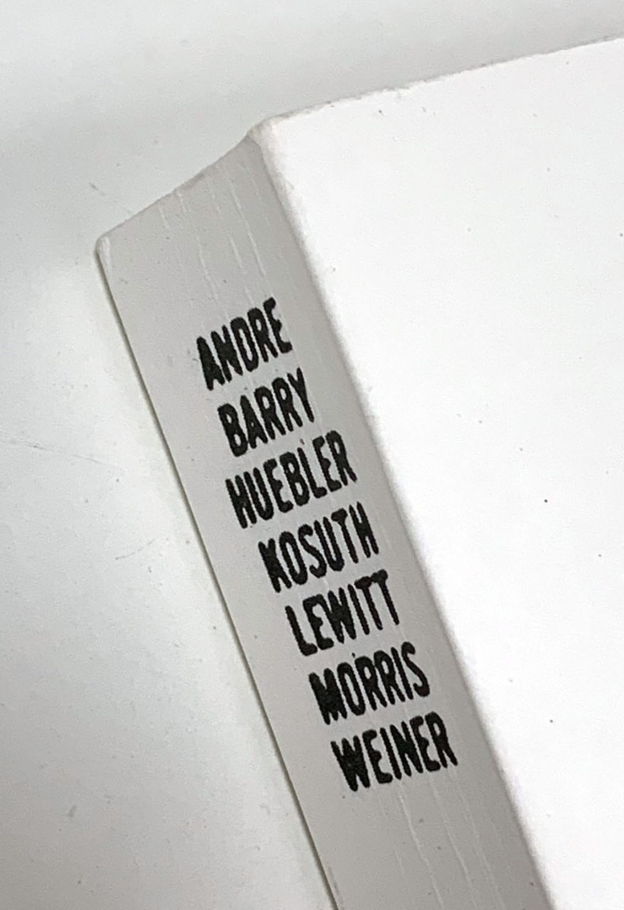 真っ白な表紙には、何も印刷されていません。めくると、タイトル・ページが現れますが、そこには、 Carl Andre(カール・アンドレ)、Robert Barry(ロバート・バリー)、Douglas Huebler(ダグラス・ヒューブラー)、Joseph Kosuth(ジョセフ・コスース)、Sol LeWitt(ソル・ル・ウィット)、Robert Morris(ロバート・モリス)、Lawrence Weiner(ローレンス・ウェイナー )と7名のアーティストの名前が、並んでいます。言わずと知れた、ミニマル、コンセプチュアル系アートの第一人者たちです。この名前の列挙が、本の正式なタイトルですが、業界では「ゼロックス・ブック」と呼ばれることが普通です。