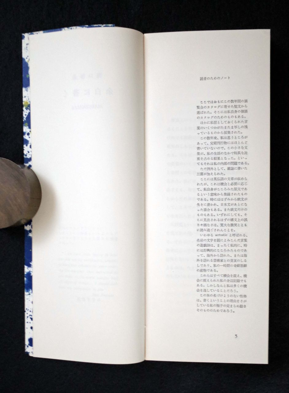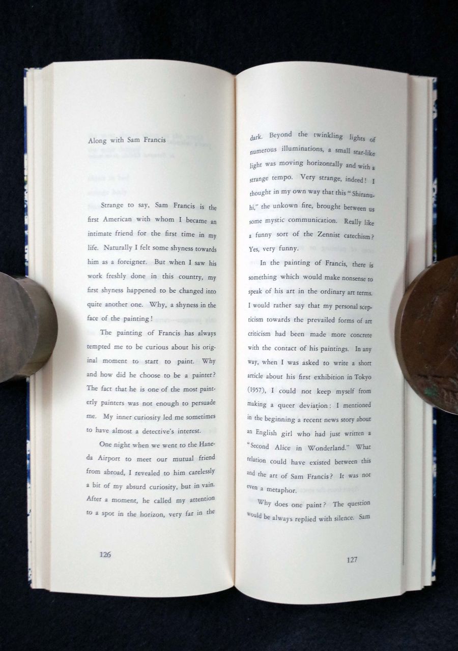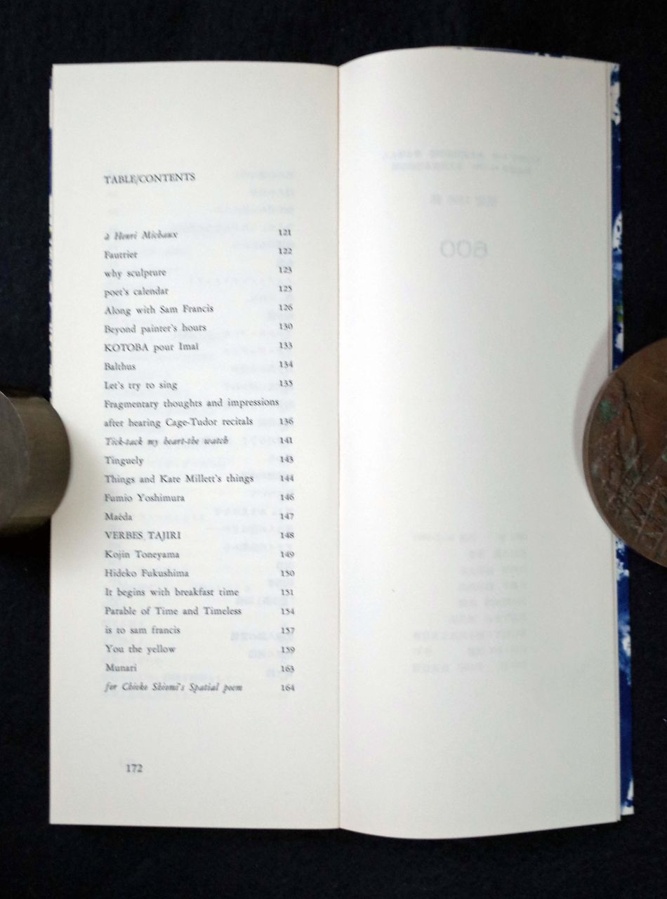 図3 本文(欧文)B5判縦半截という縦長の判型に、本文横組みという特異な造本(図2,3)、サム・フランシスによる青い表紙(図4)の瀟洒な装幀。瀧口の自装です。タイトル頁の前の、遊び紙の裏側(図5)で、以下のように解説され、私信からの引用でしょうか、サムの言葉も記されています。