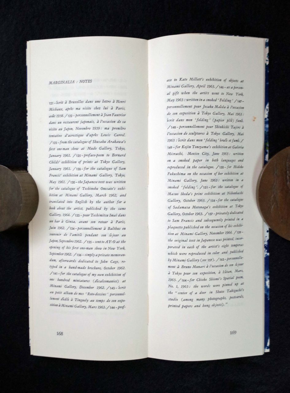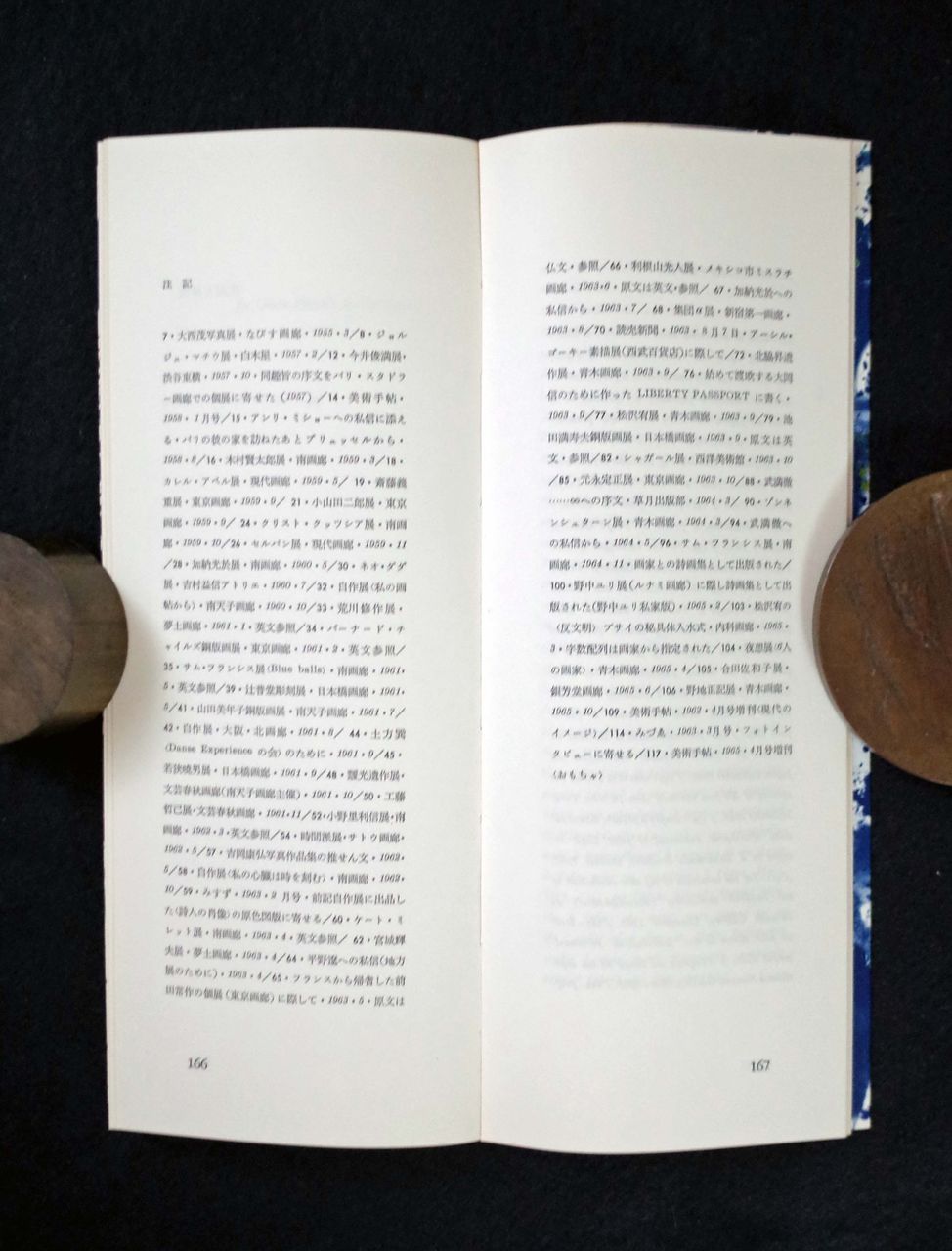 ここに述べられた「私的」「交友のしるし」という言葉は、アクロスティック詩に限らず、本書に収録された各篇にも共通する点と思われます。本書の初出一覧に相当する「注記」(図10)や“NOTES”(図11)によれば、上で見た他の作家たちに関する邦文篇の48篇のうち、以下に触れる例外2篇を除いた46篇は、展覧会に際して書かれた序文や詩・私信です。いずれも作家に寄り添い共感する立場から書かれており、前著『点』までの、多かれ少なかれ客観性や批判が必要だった美術評論とは、大きく異なっています。