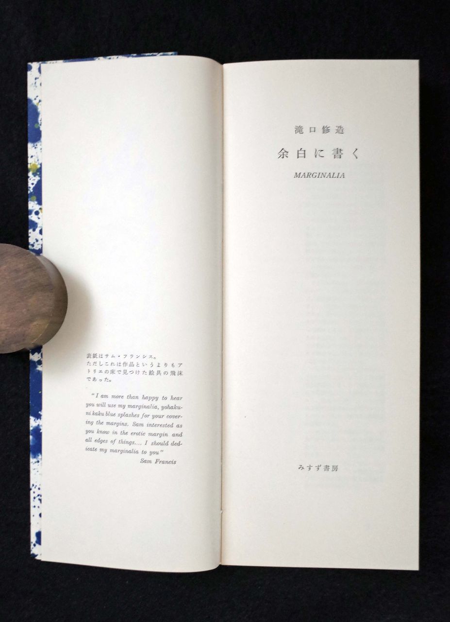 B5判縦半截という縦長の判型に、本文横組みという特異な造本(図2,3)、サム・フランシスによる青い表紙(図4)の瀟洒な装幀。瀧口の自装です。タイトル頁の前の、遊び紙の裏側(図5)で、以下のように解説され、私信からの引用でしょうか、サムの言葉も記されています。