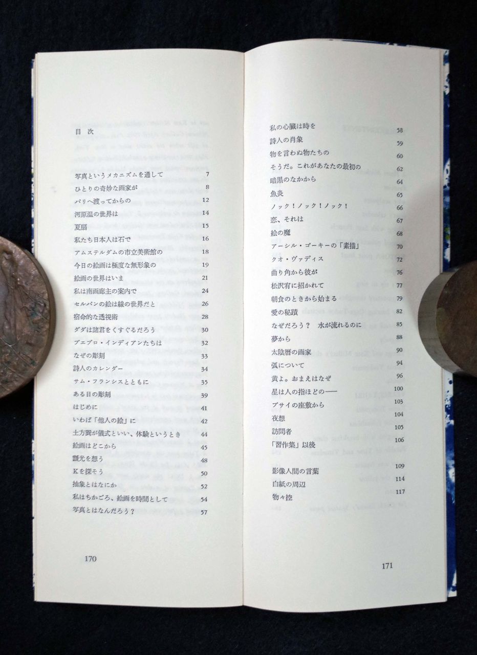 図5 タイトル頁と遊び紙裏面本文は邦文55篇と欧文(英仏文)25篇の2部で構成され、両部の間に薄葉紙が挟み込まれています。邦文の部はさらに前半52篇と後半3篇の2部に分かれ、前半の52篇では、大西茂写真展に際して書かれた「写真というメカニズムを通して」(1955年3月)から、野地正記展に際して書かれた「『習作集』以降」(1965年10月)までが、年代順に並べられています。後半の3篇は自らの造形を念頭に書かれたと思われる「影像人間の言葉」(1962年4月)、および「オブジェの店」をひらく構想などに触れた「白紙の周辺」(1963年3月)と「物々控」(1965年4月)です(図6)。前半の52篇のうち、「プエブロ・インディアンたちは」「いわば『他人の絵』に」「私の心臓は時を」「詩人の肖像」の4篇は、自作展に際して書かれたものですから、他の作家に関するものは48篇ということになります。